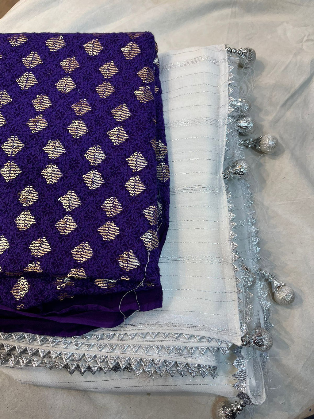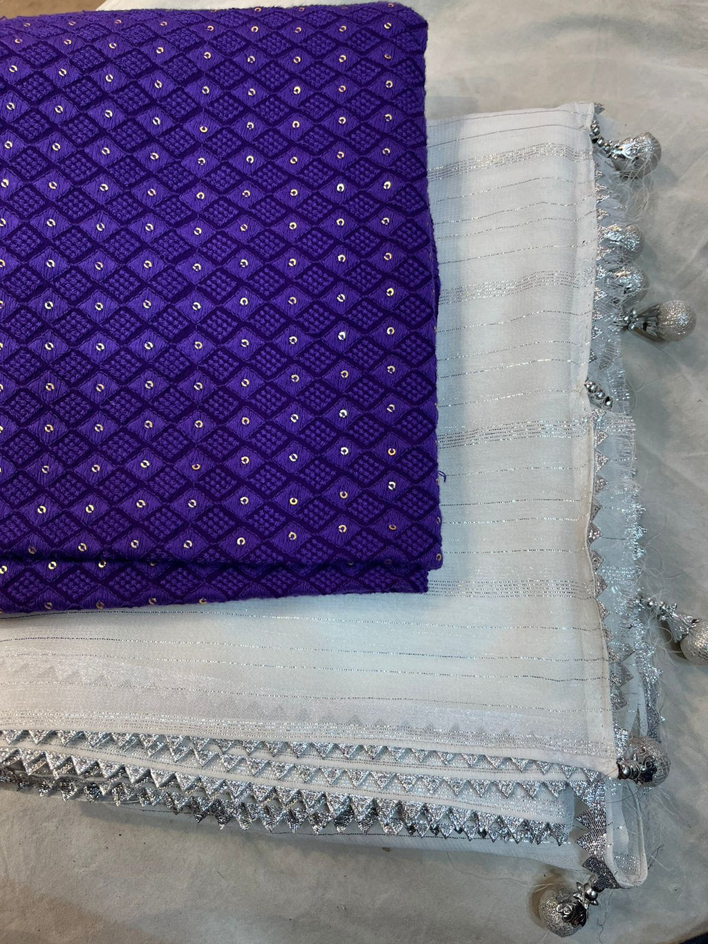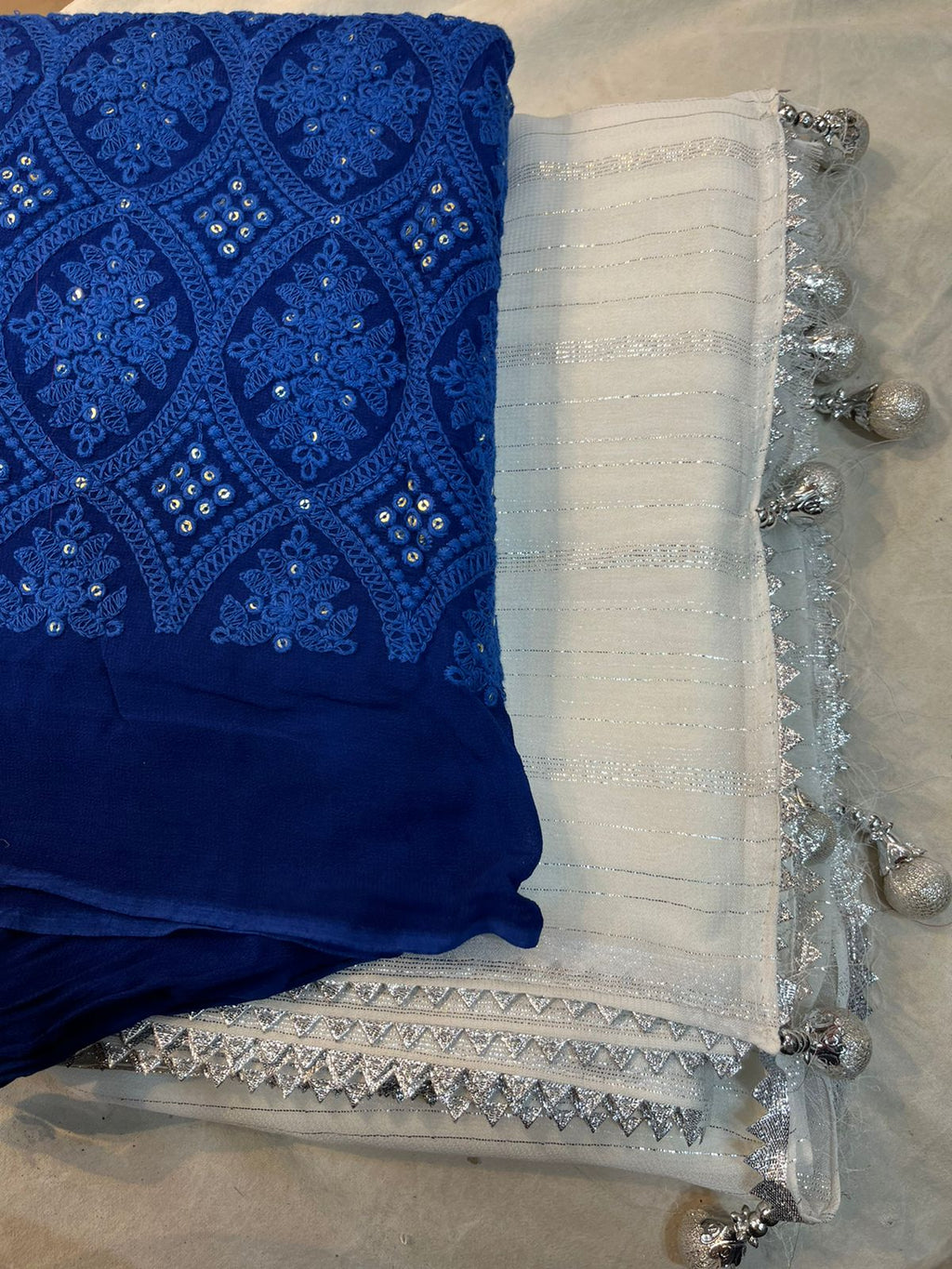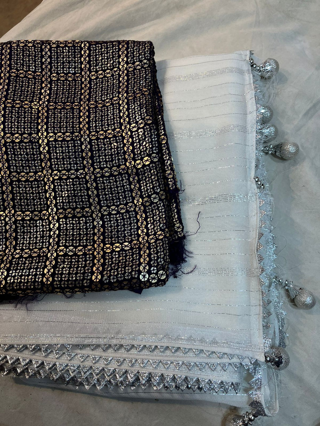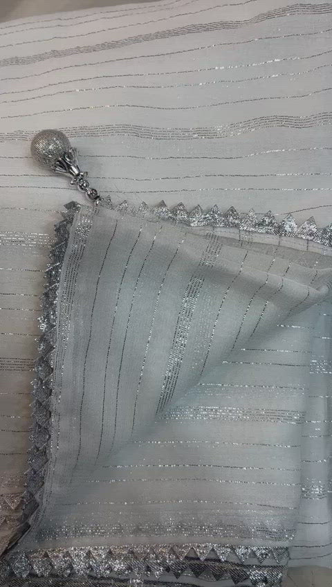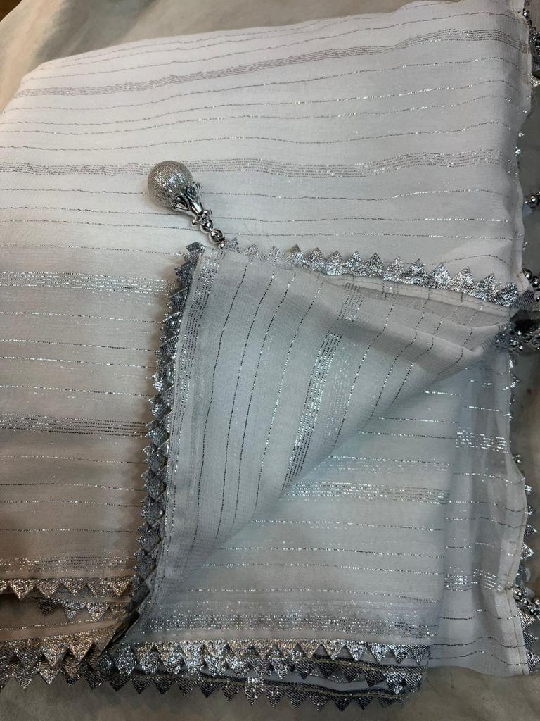 • Georgette saree with silver lurex lines, triangle lace and Tassels and thread sequins blouse. Colors can be customized.