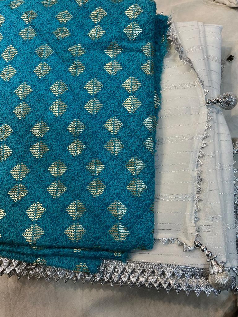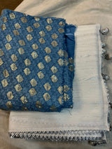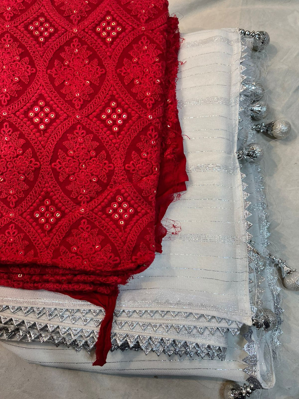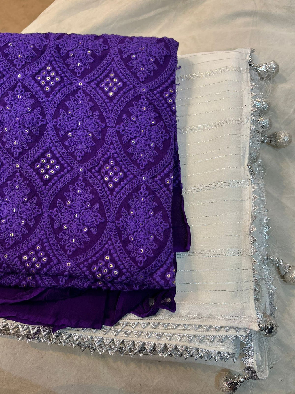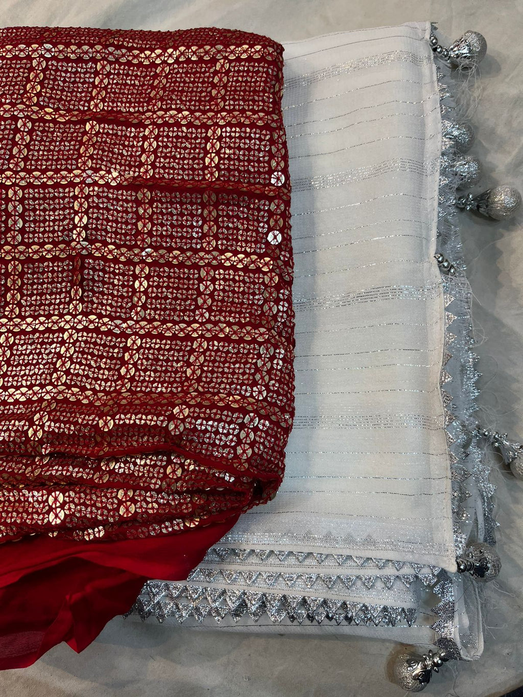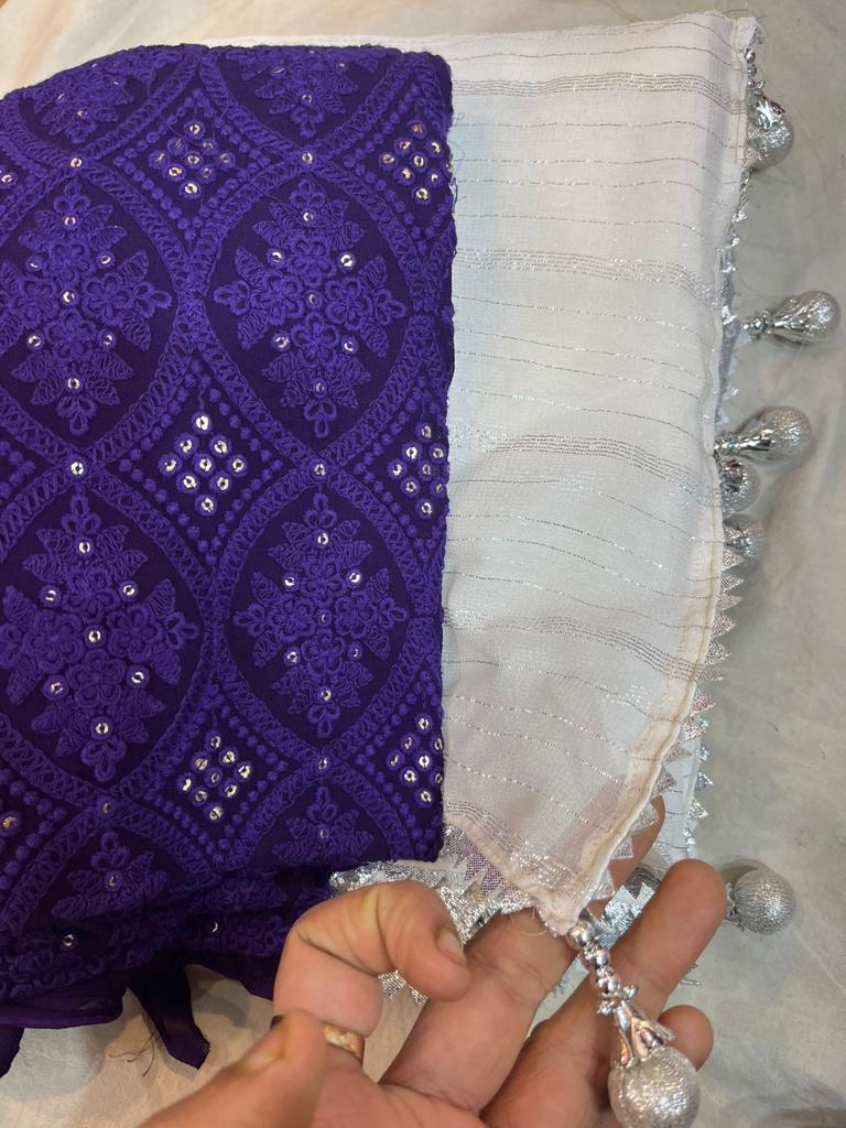 • Georgette saree with silver lurex lines, triangle lace and Tassels and thread sequins blouse. Colors can be customized.