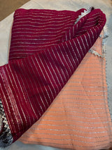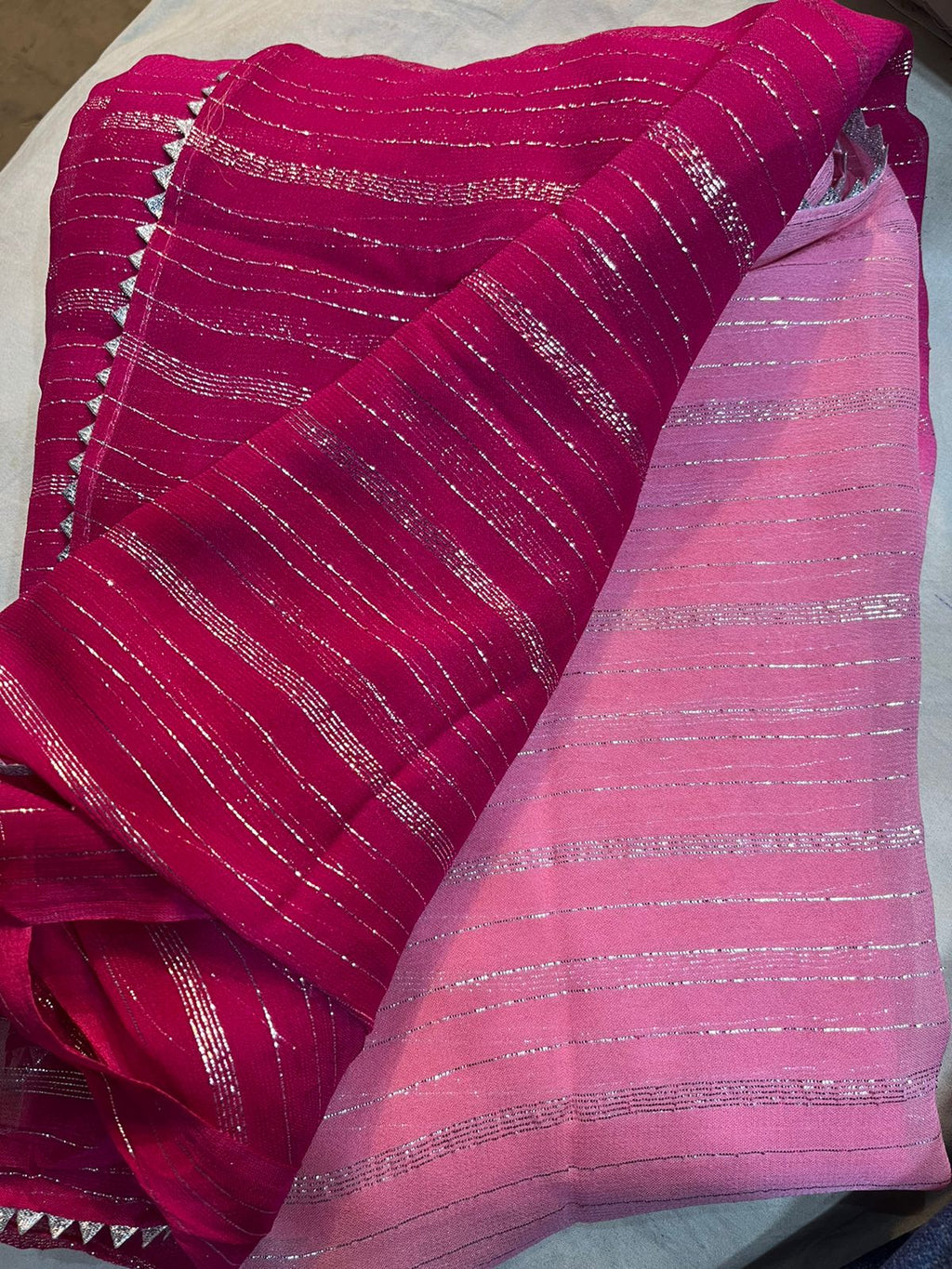 • The modern looking pure banarasi Georgette saree is of beautiful double shade. Mesmerizing silver zari lines design is weaved all over the saree. The complementary matching silver triangle gives this saree a stylish look.