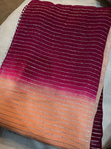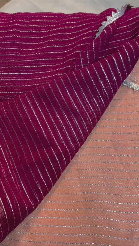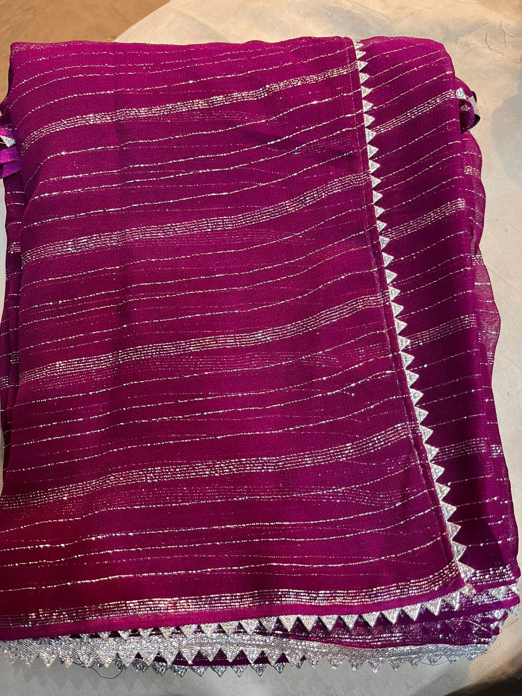 • Banarasi Georgette saree with silver zari lines and triangle lace border.