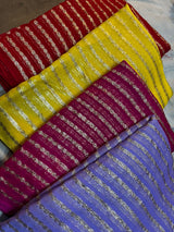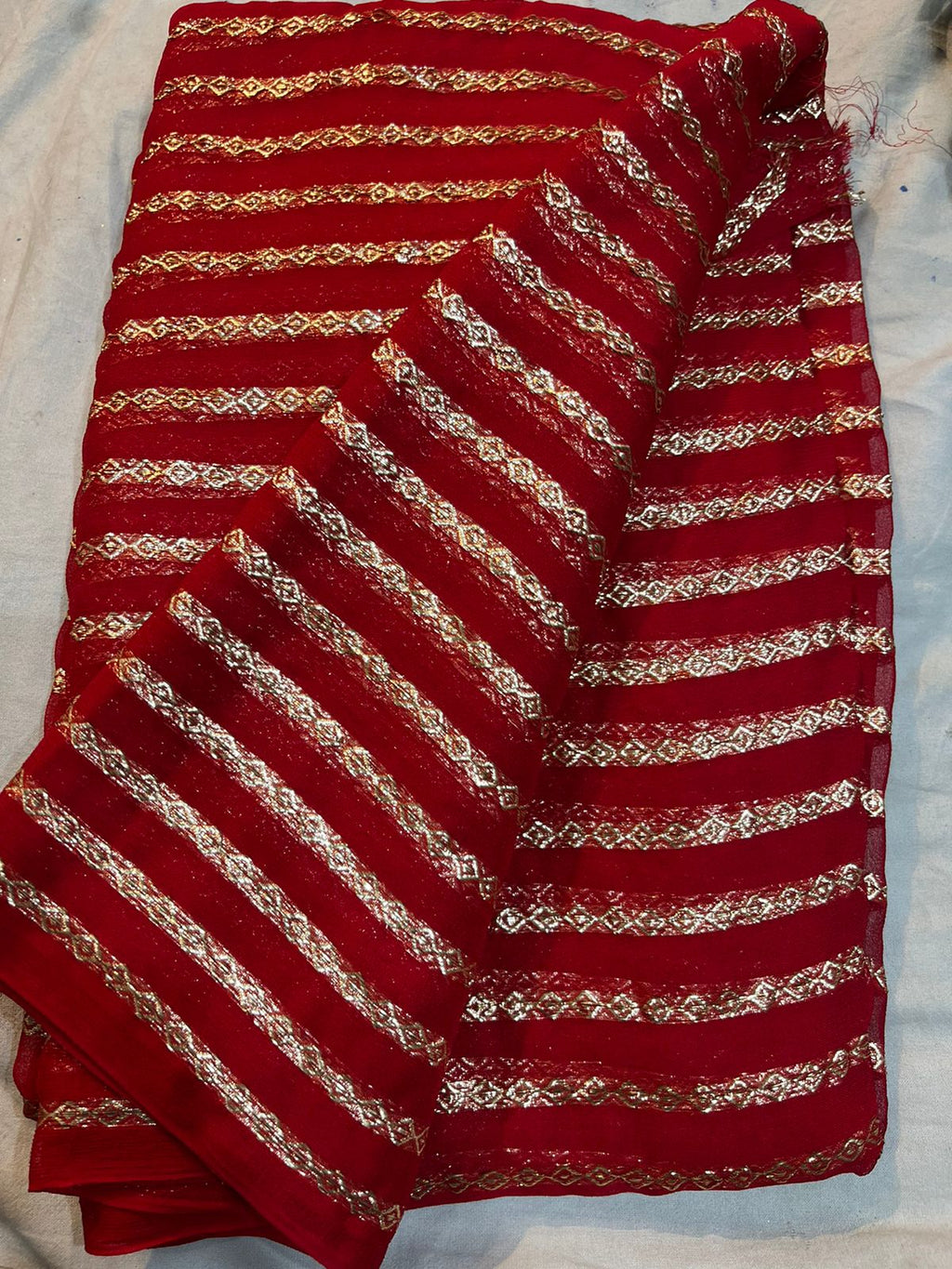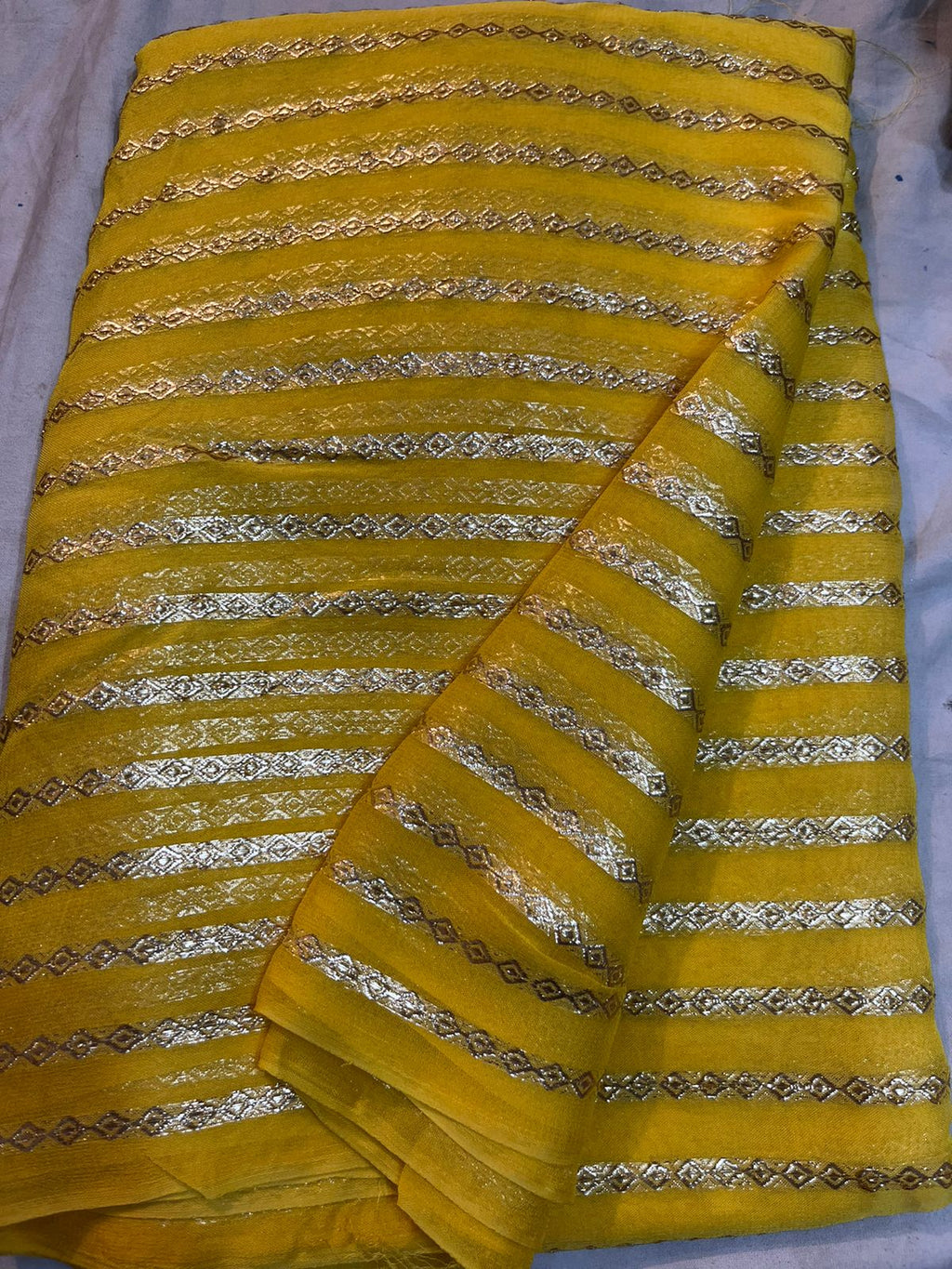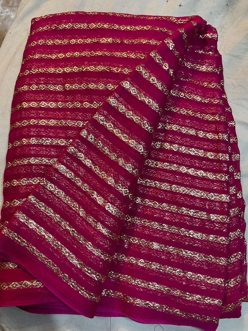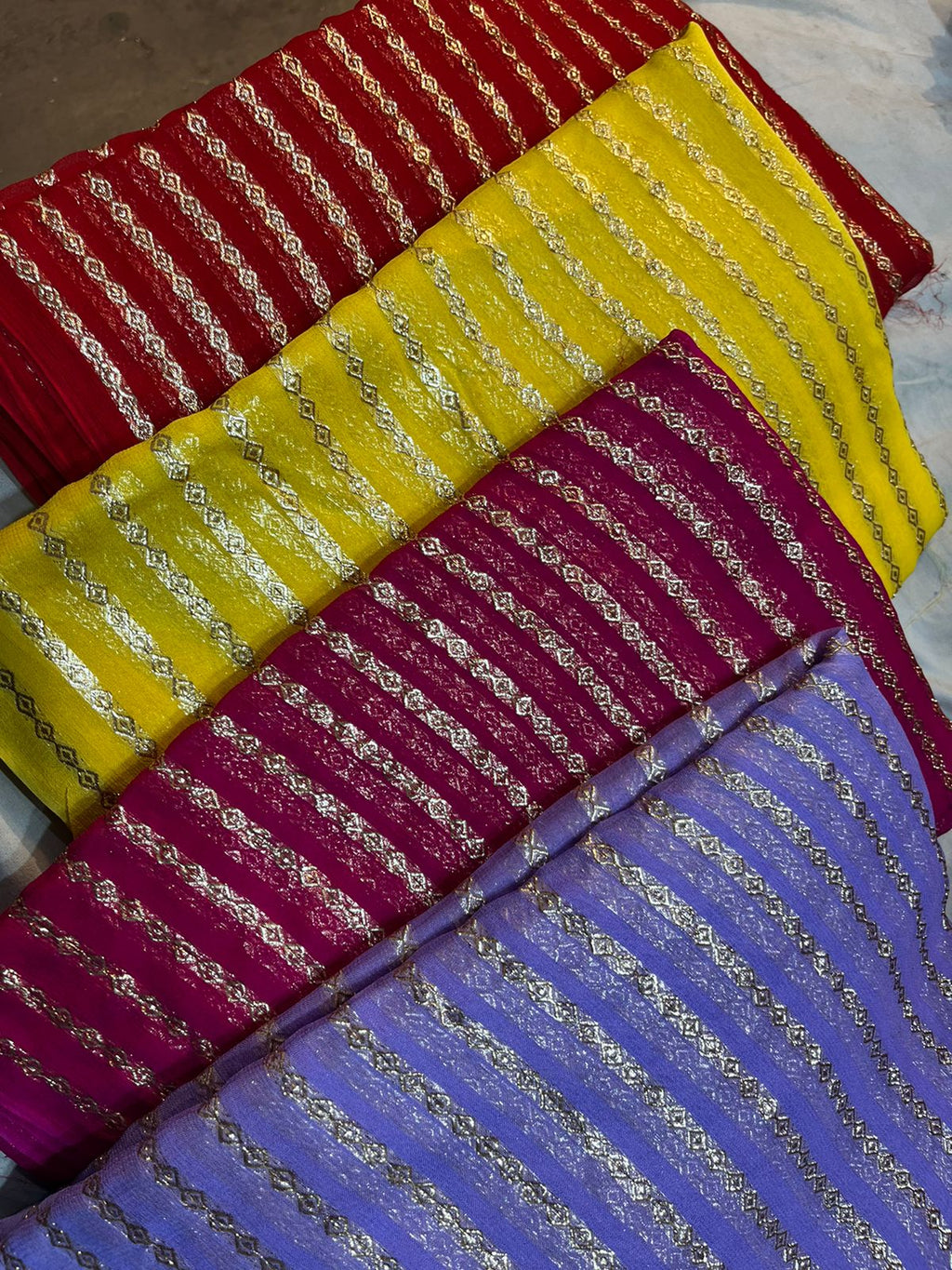 - Premium and Stylish Georgette saree with silver zari line weaving without blouse.