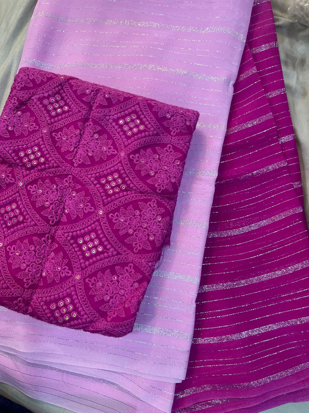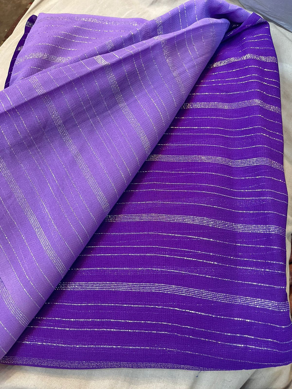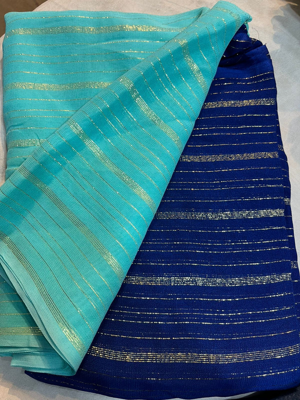 - The modern looking pure banarasi Georgette saree is of beautiful double shade. Mesmerizing silver zari lines design is weaved all over the saree. The complementary matching banarasi zari blouse gives this saree a stylish look.