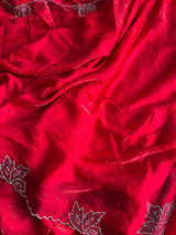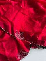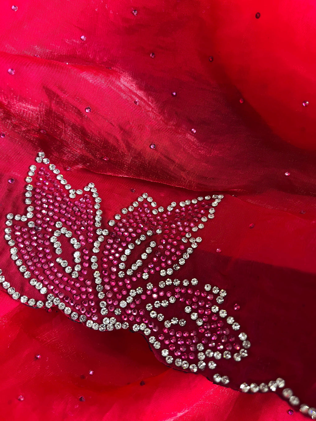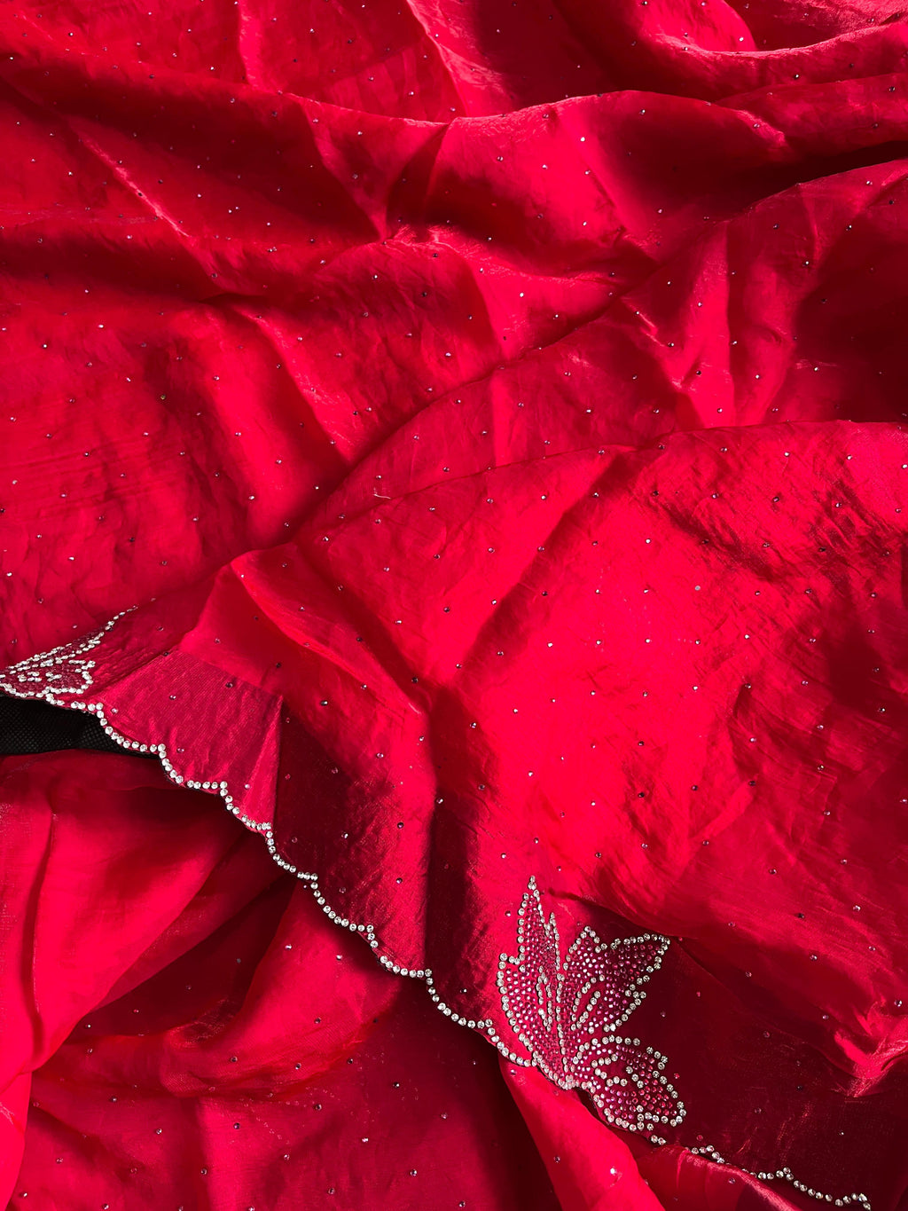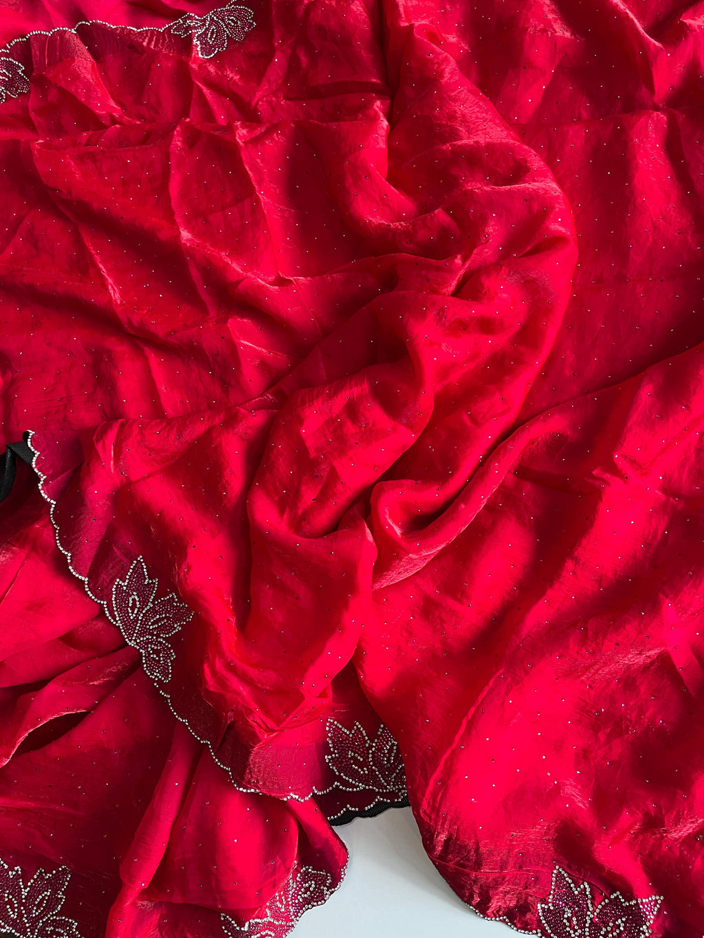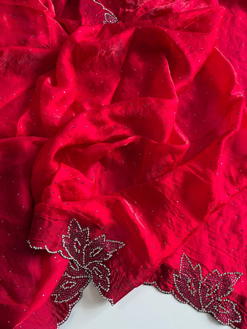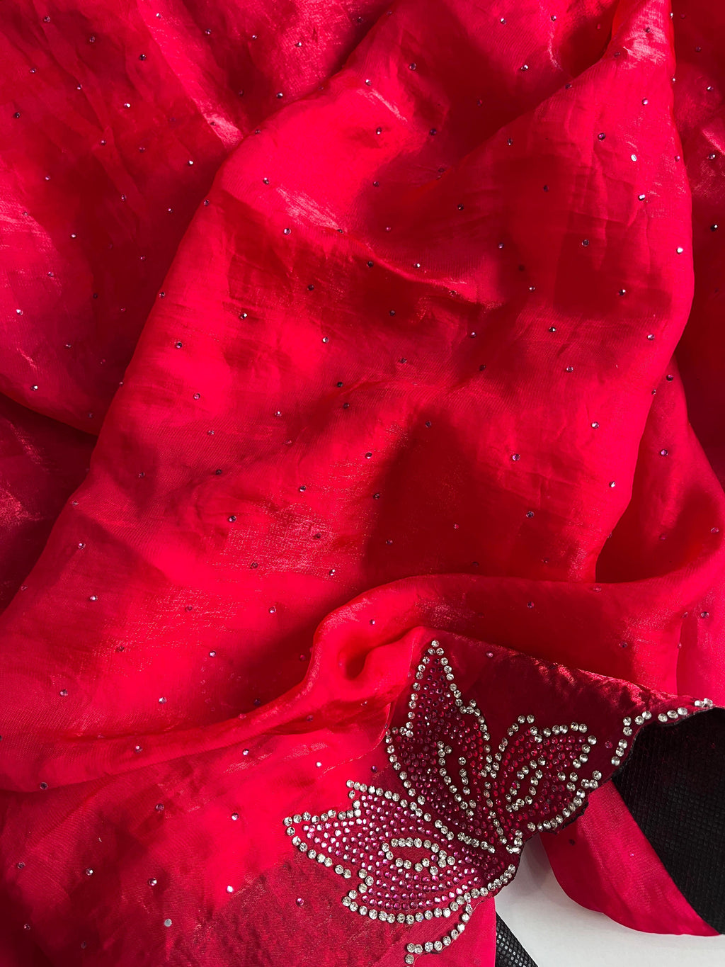 Radiate charm and elegance with this faux georgette saree, designed in a graceful red hue that symbolizes love and celebration. The lightweight drape is enhanced with delicate Swarovski work, adding just the right amount of sparkle to elevate your look.