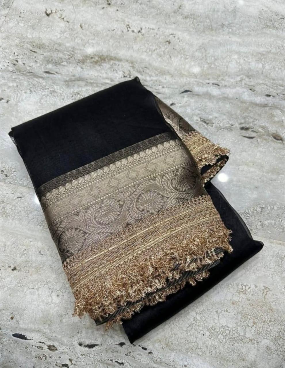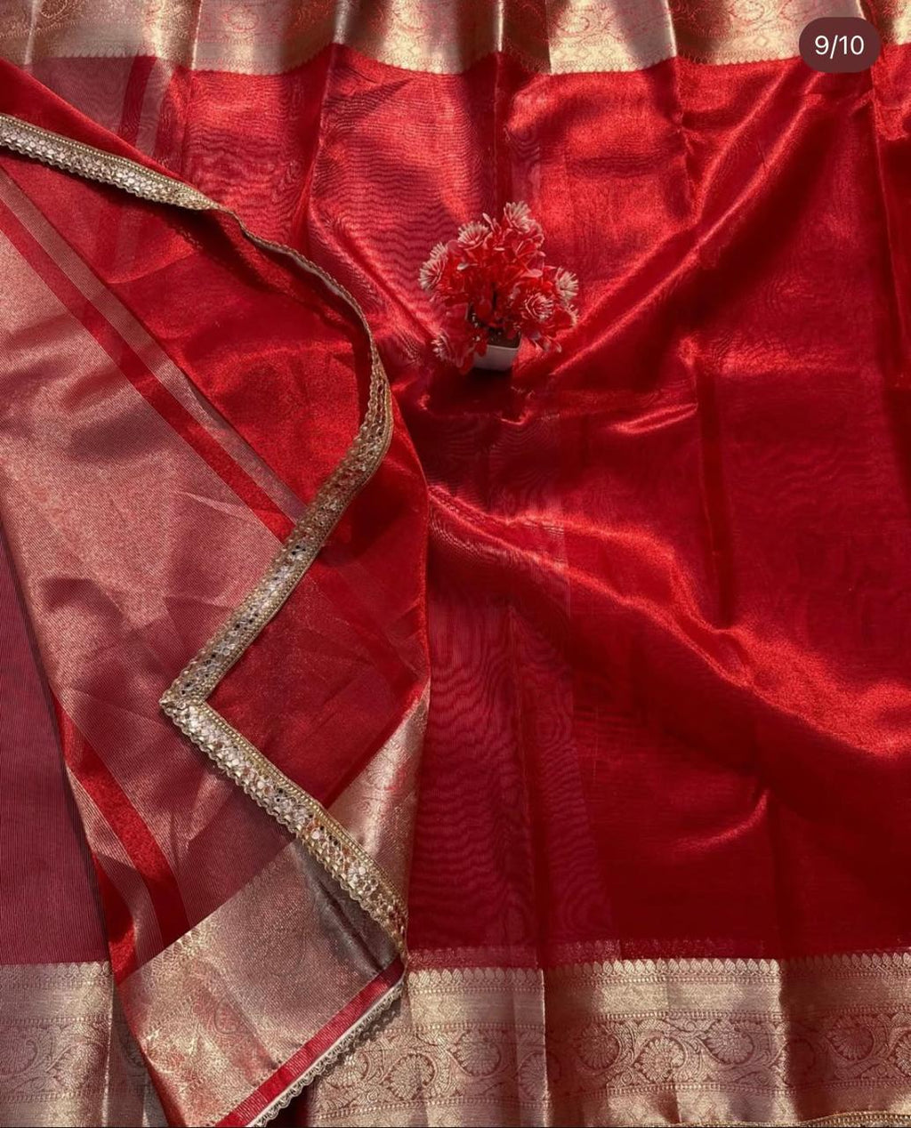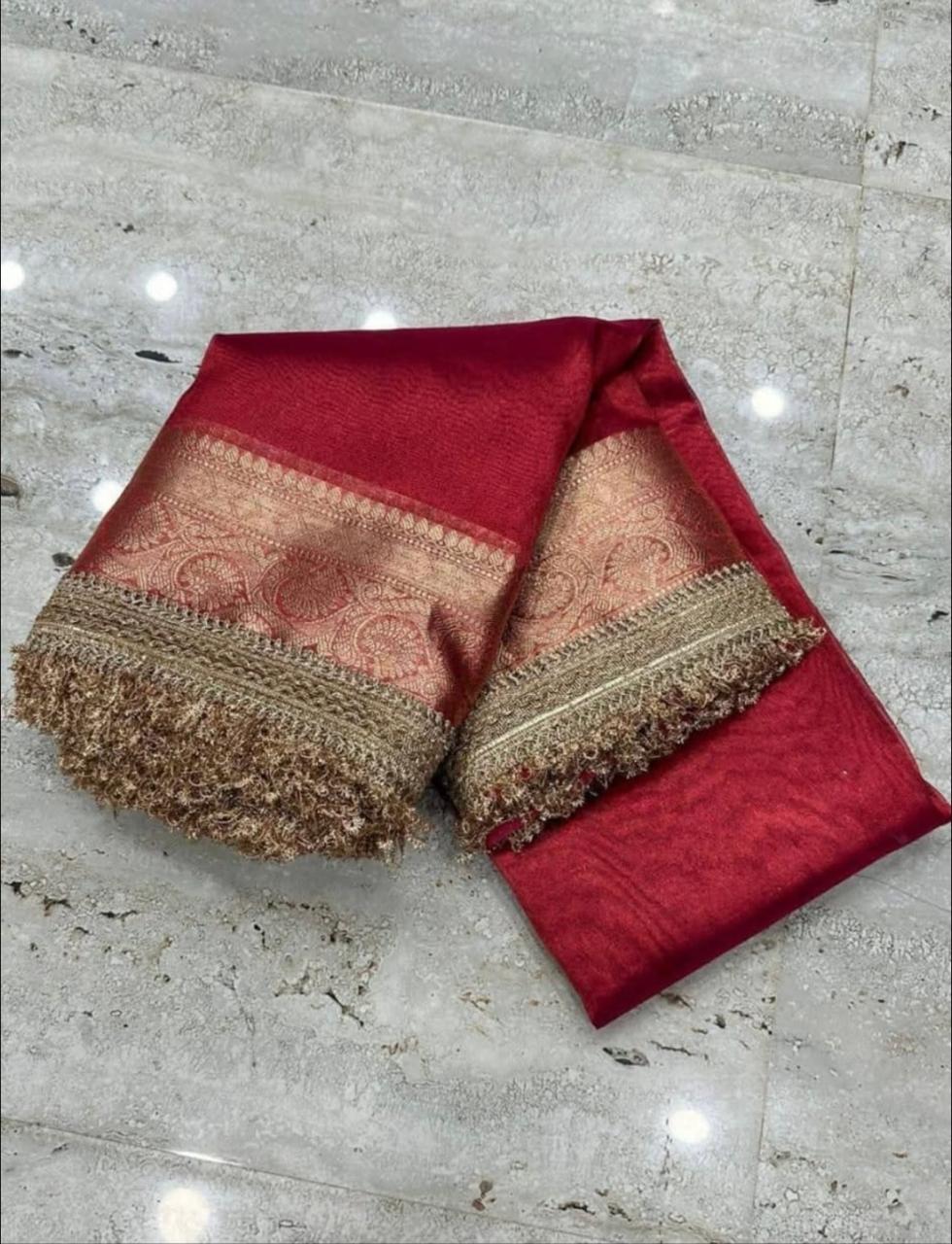 Step into elegance with Rivya, a Banarasi Semi Tissue Silk Saree that blends traditional craftsmanship with a soft, graceful drape. The saree features a subtle sheen and intricate traditional weave, making it a perfect choice for festive occasions, weddings, and elegant celebrations.