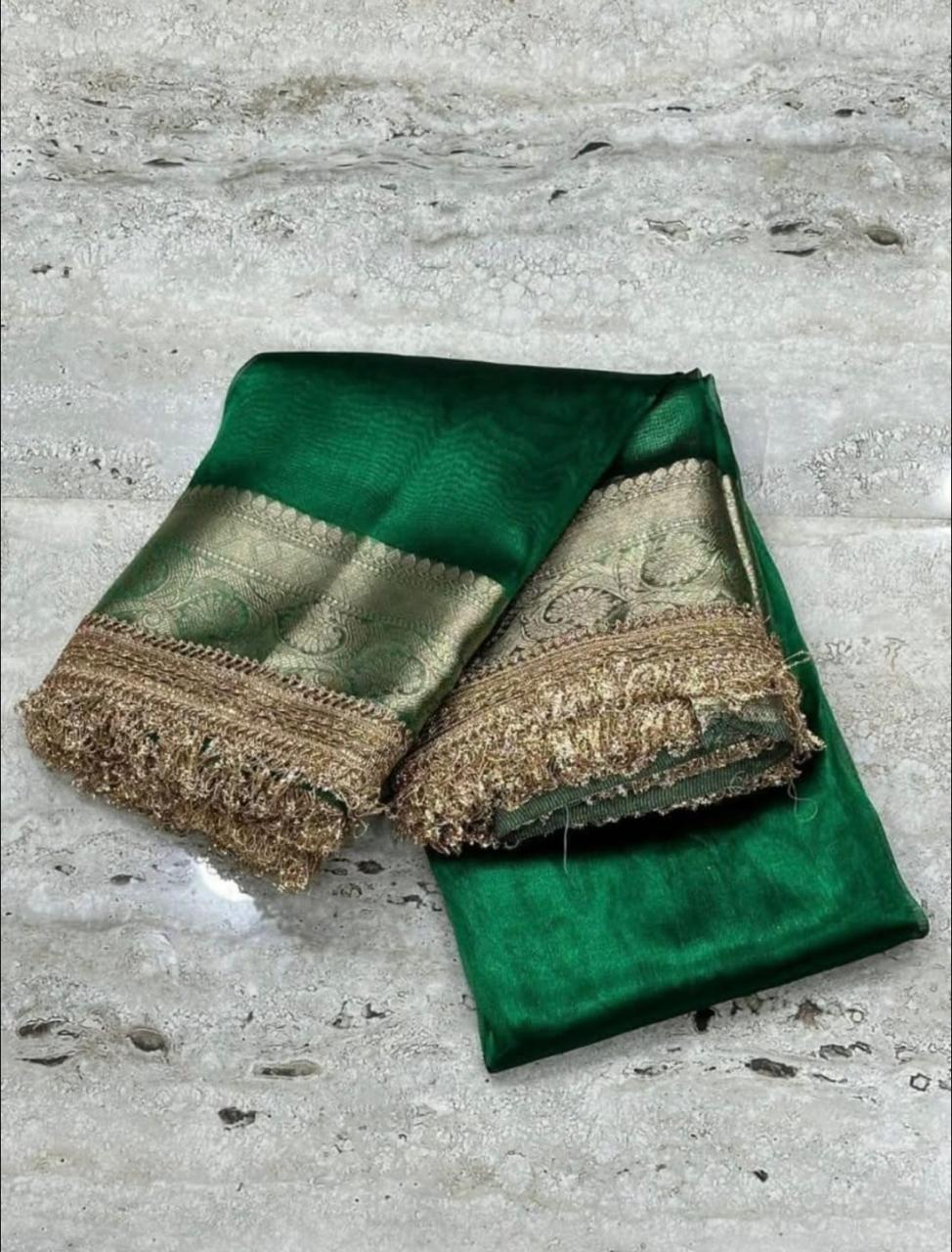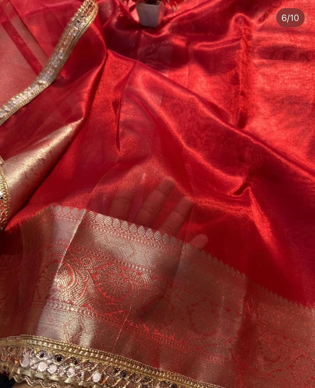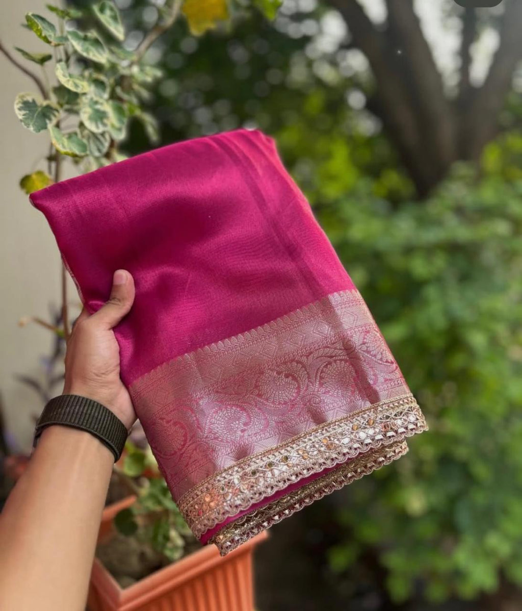 Step into elegance with Rivya, a Banarasi Semi Tissue Silk Saree that blends traditional craftsmanship with a soft, graceful drape. The saree features a subtle sheen and intricate traditional weave, making it a perfect choice for festive occasions, weddings, and elegant celebrations.