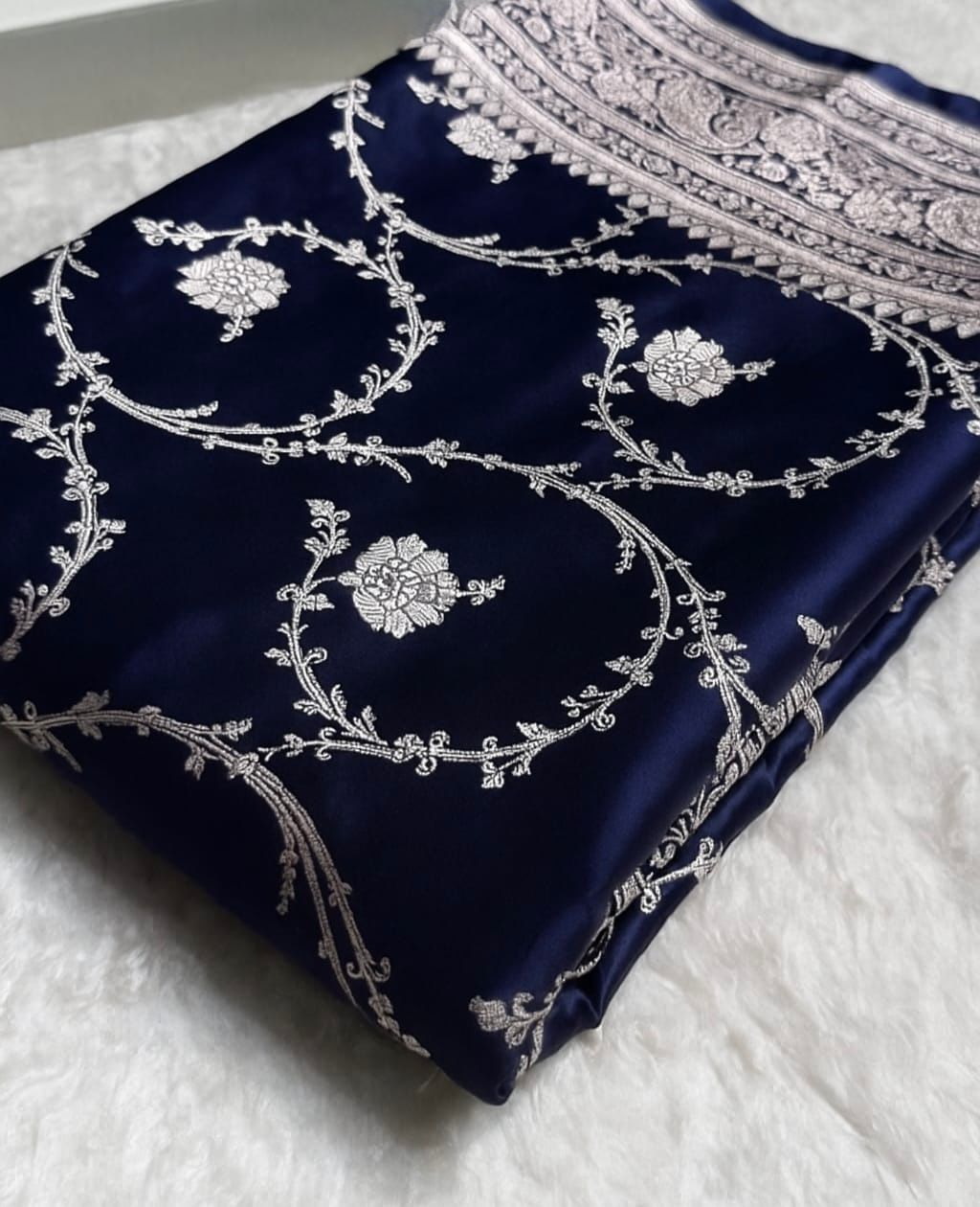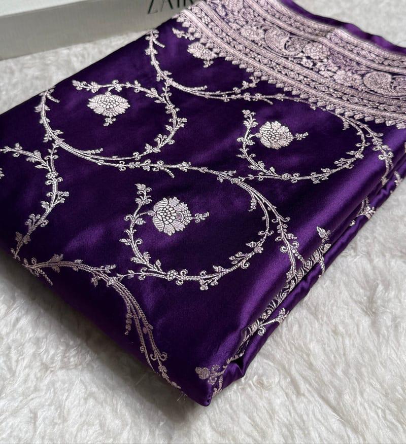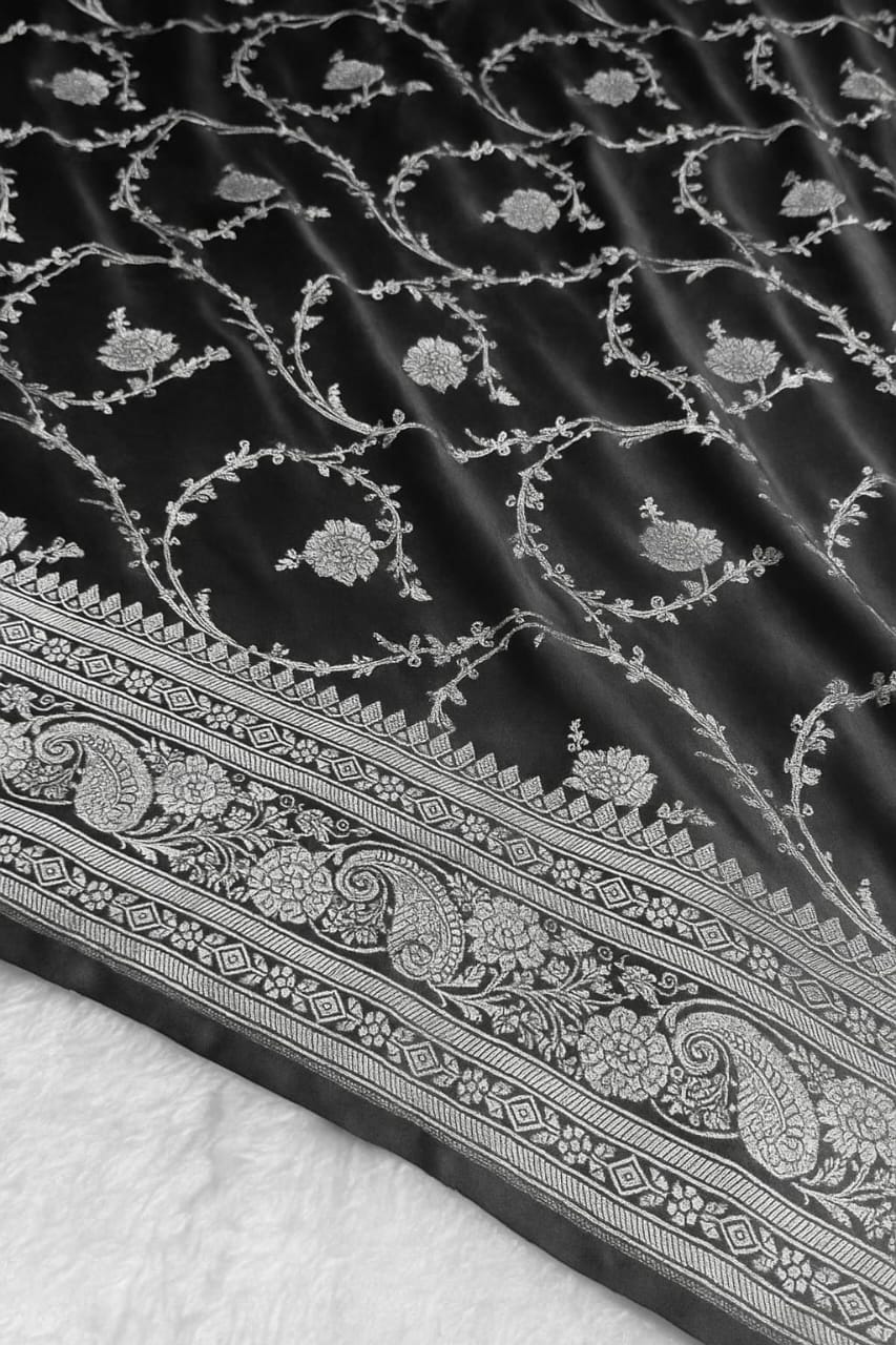 A saree that blends classic Banarasi artistry with modern sophistication — a must-have for every connoisseur of fine weaves.