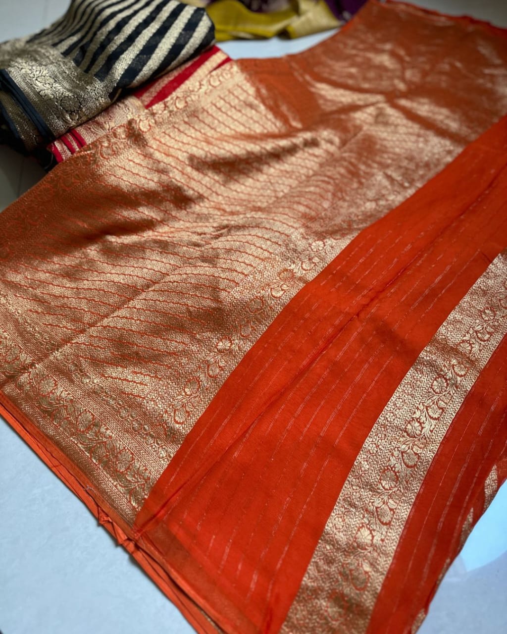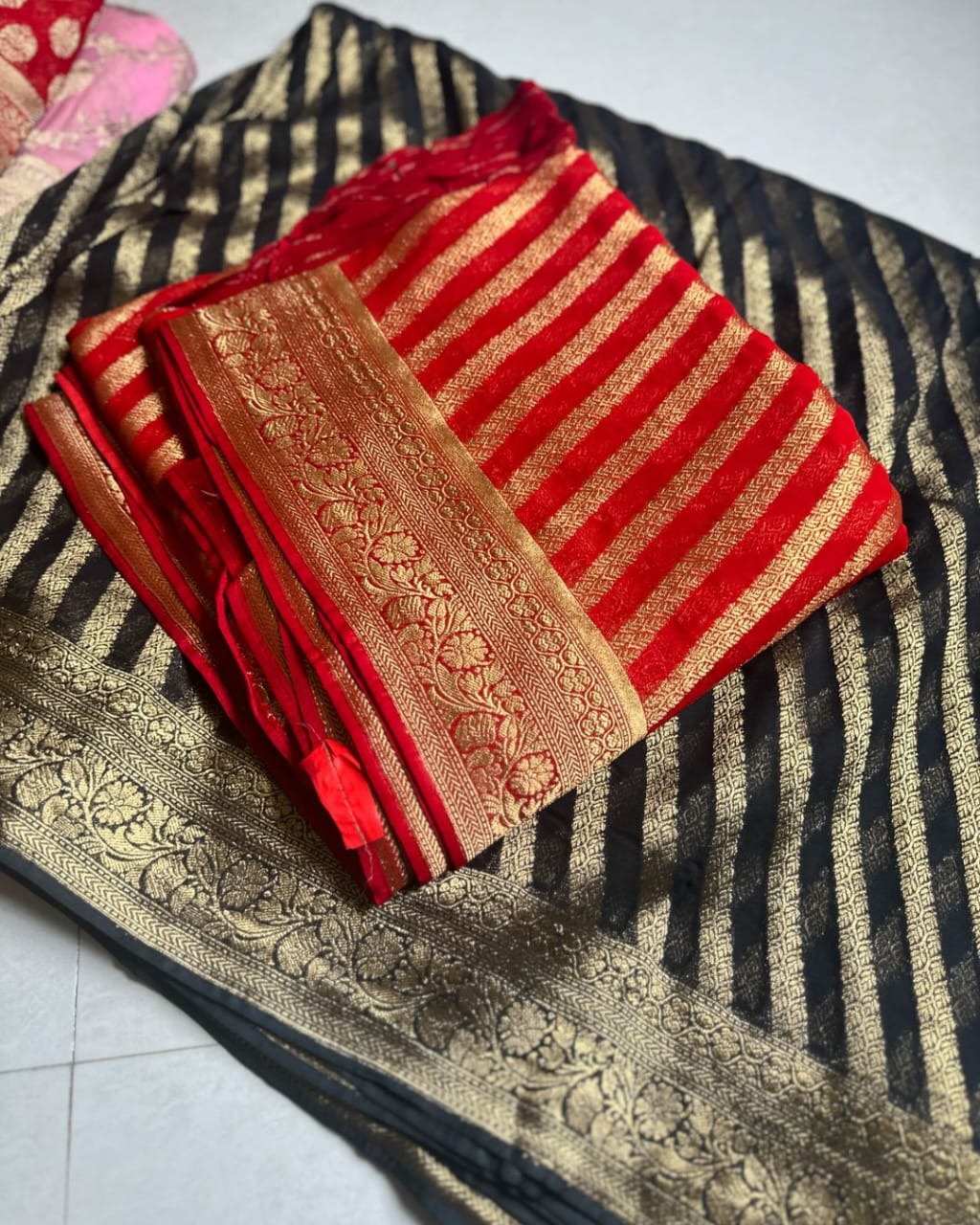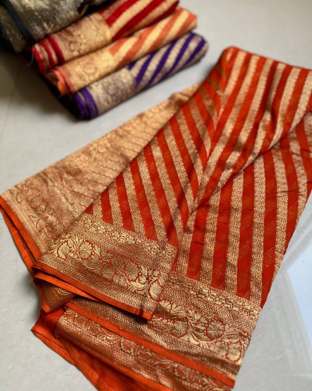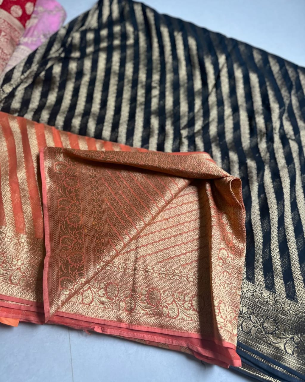 Elevate your ethnic wardrobe with this dyable Banarasi semi-georgette saree, crafted for elegance and versatility. The saree features a classic striped pattern that flows gracefully, creating a refined and timeless look.