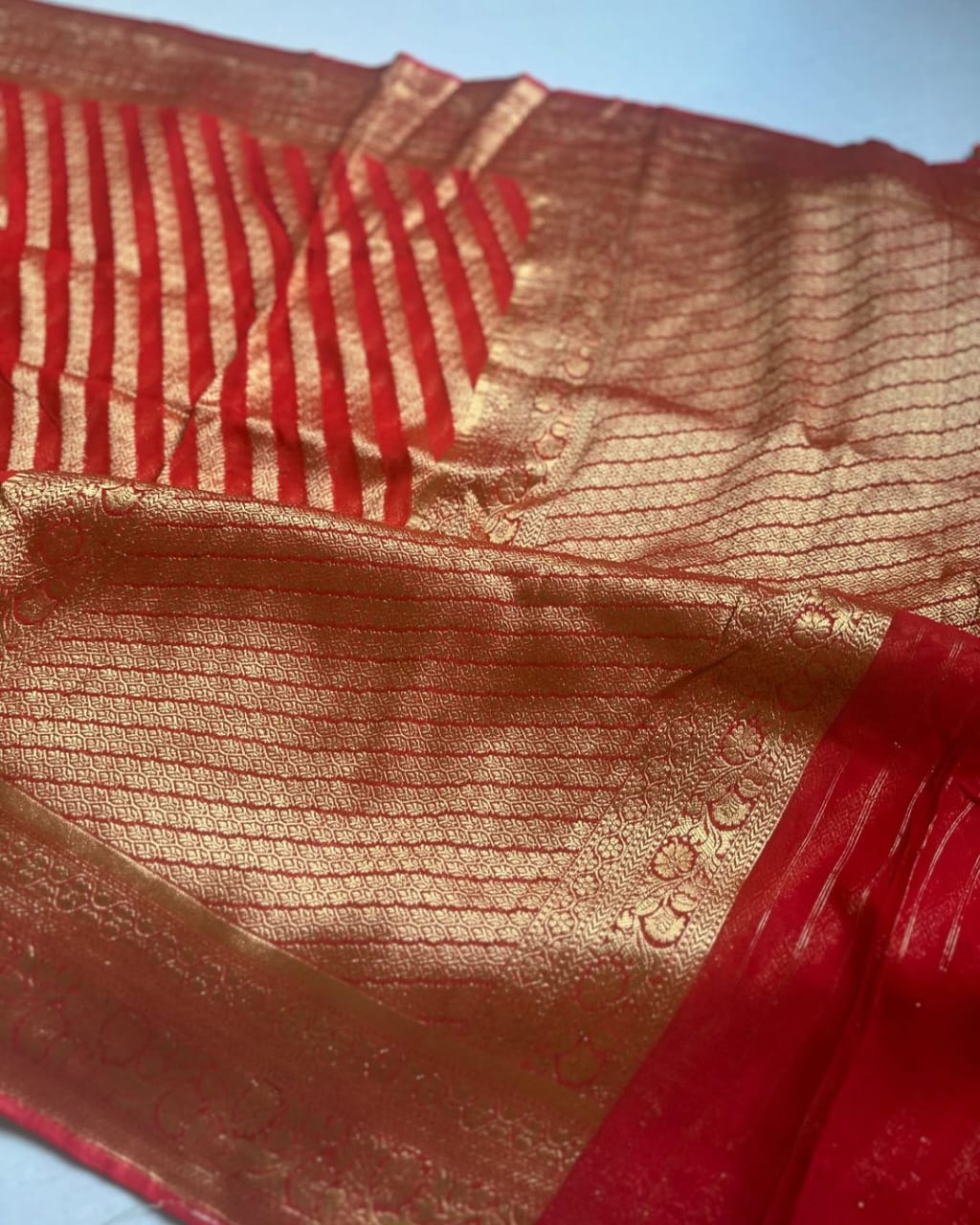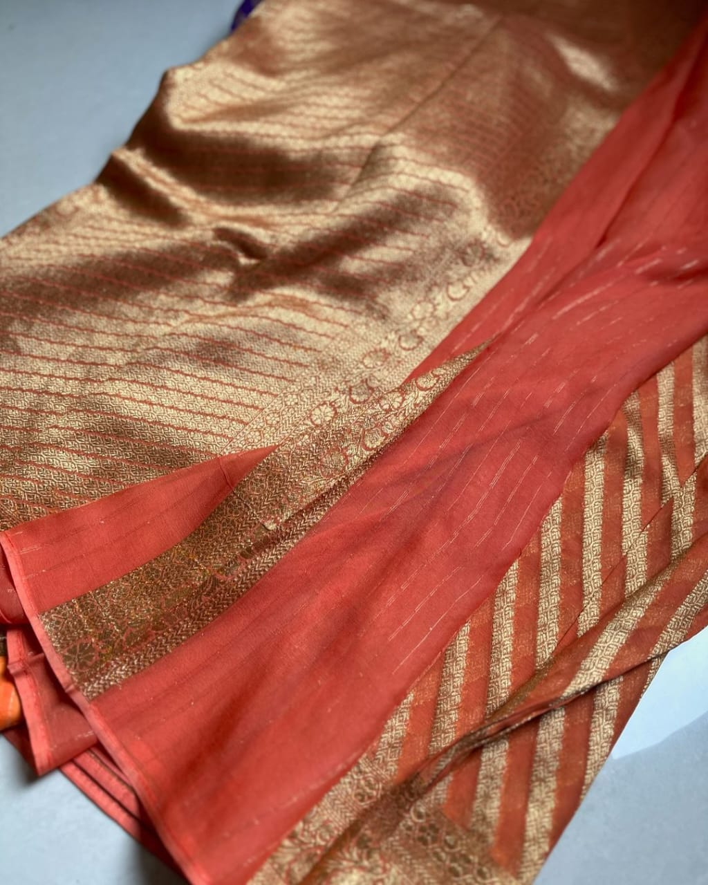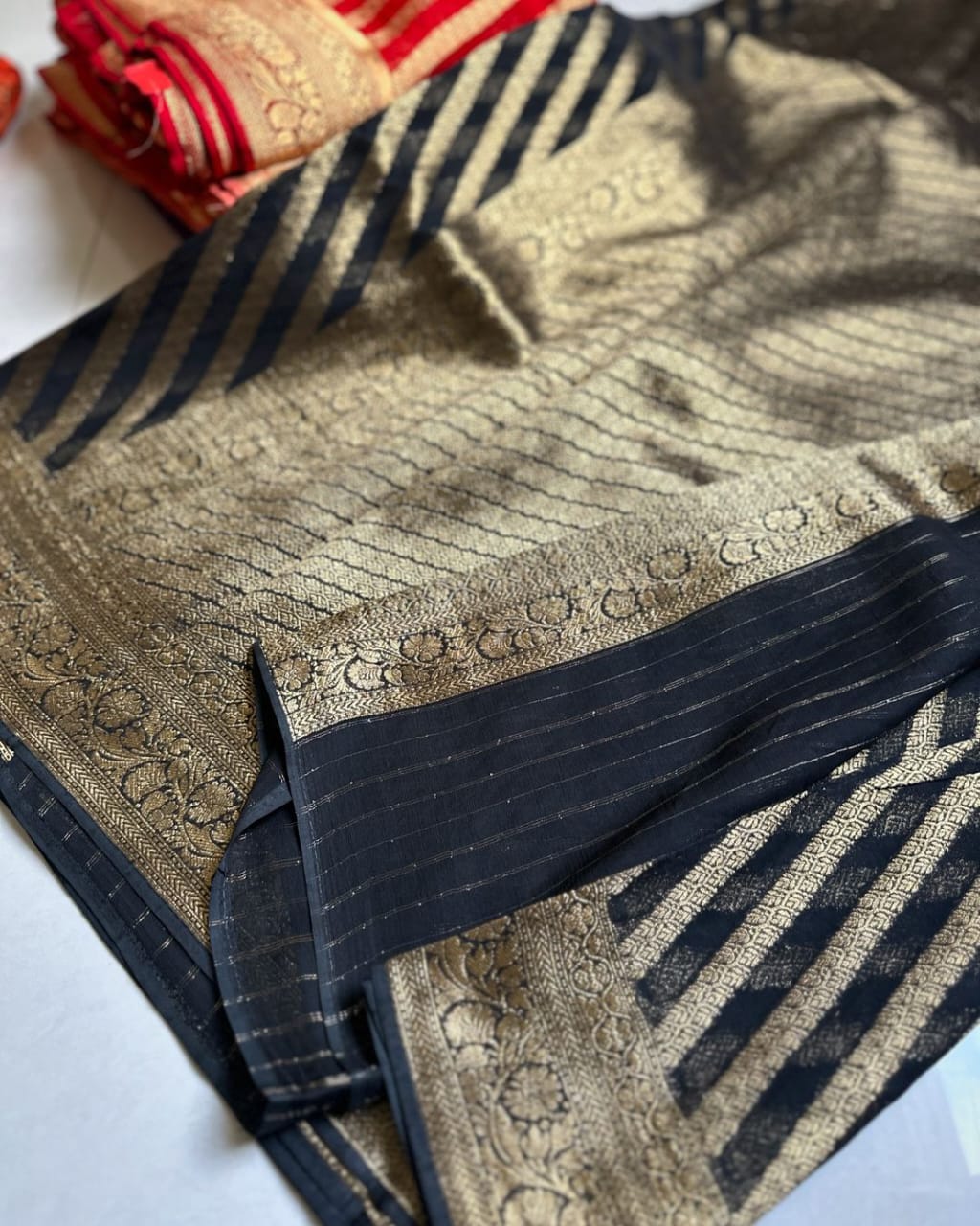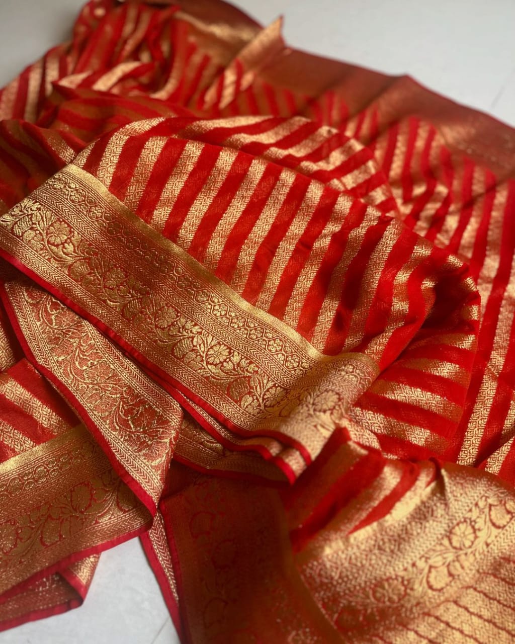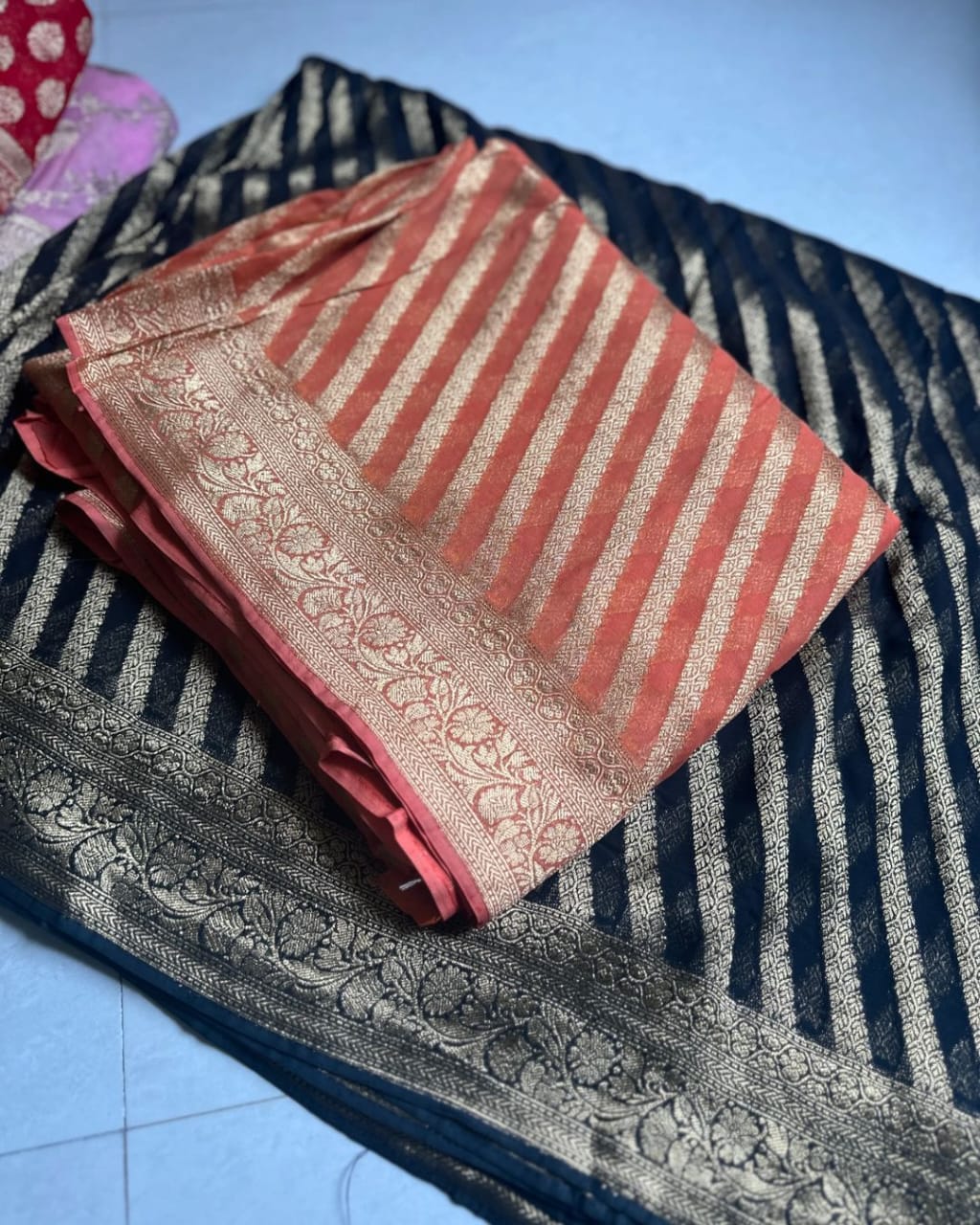 Elevate your ethnic wardrobe with this dyable Banarasi semi-georgette saree, crafted for elegance and versatility. The saree features a classic striped pattern that flows gracefully, creating a refined and timeless look.