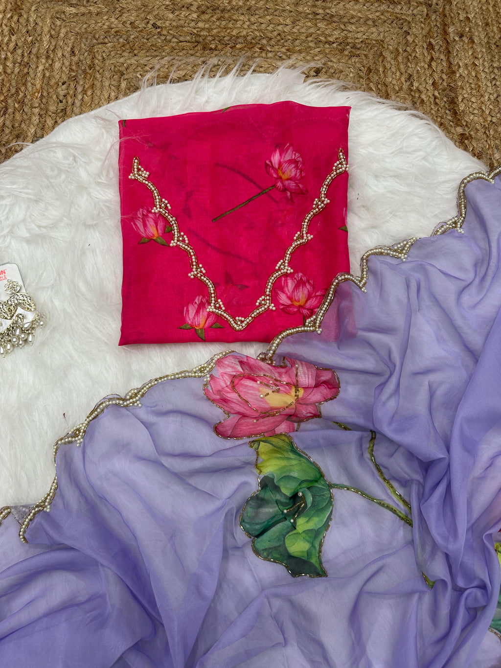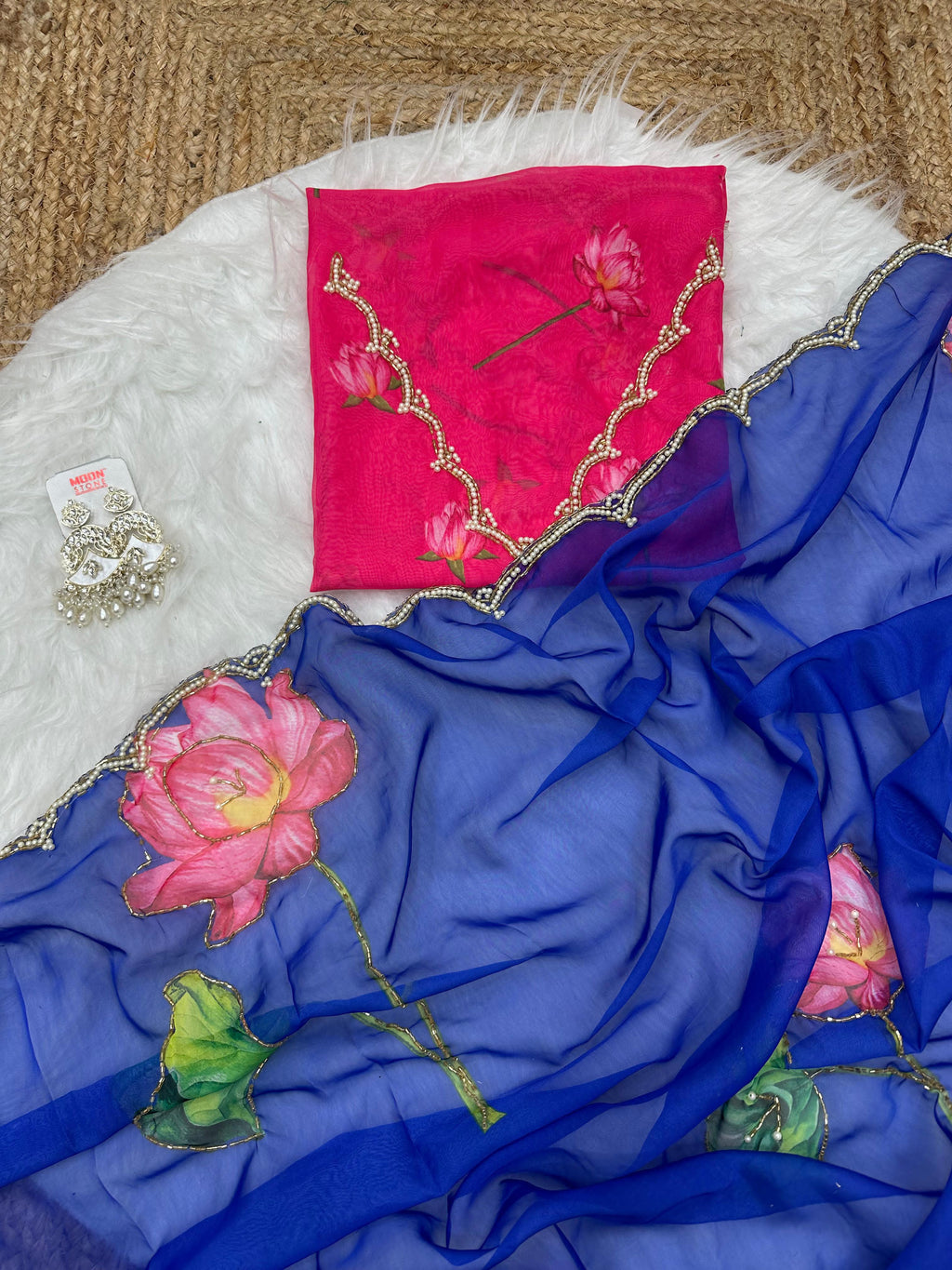 Step into timeless elegance with this floral printed Tebi digital saree, crafted for a soft, graceful drape. The vibrant digital floral prints exude modern charm, while the handworked blouse adds a touch of artisanal finesse – making it perfect for special occasions.