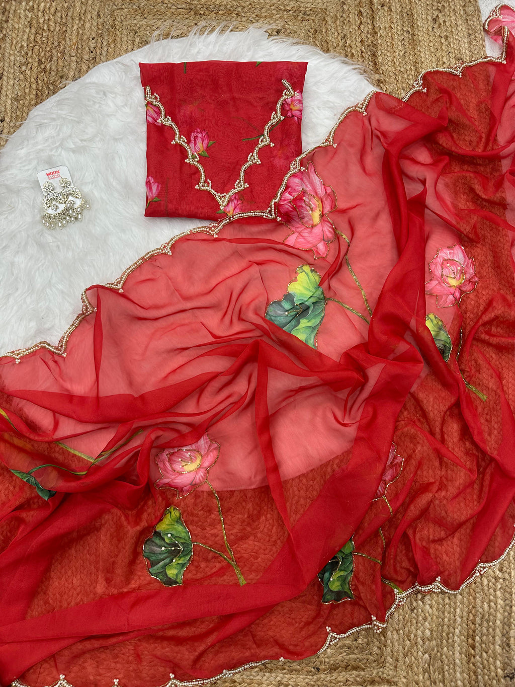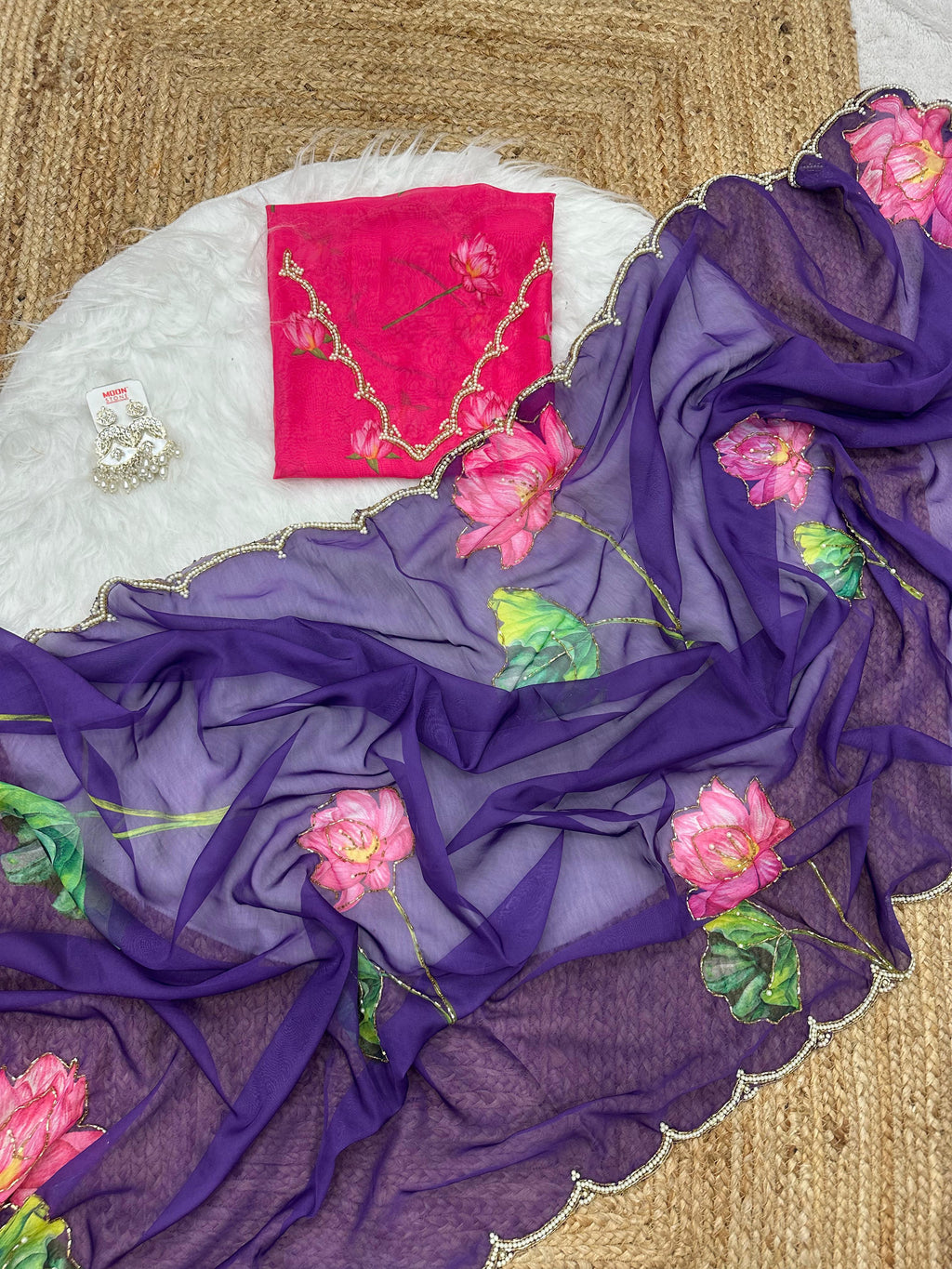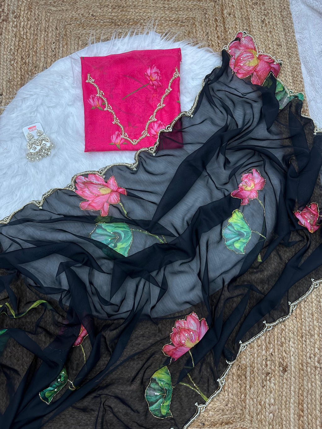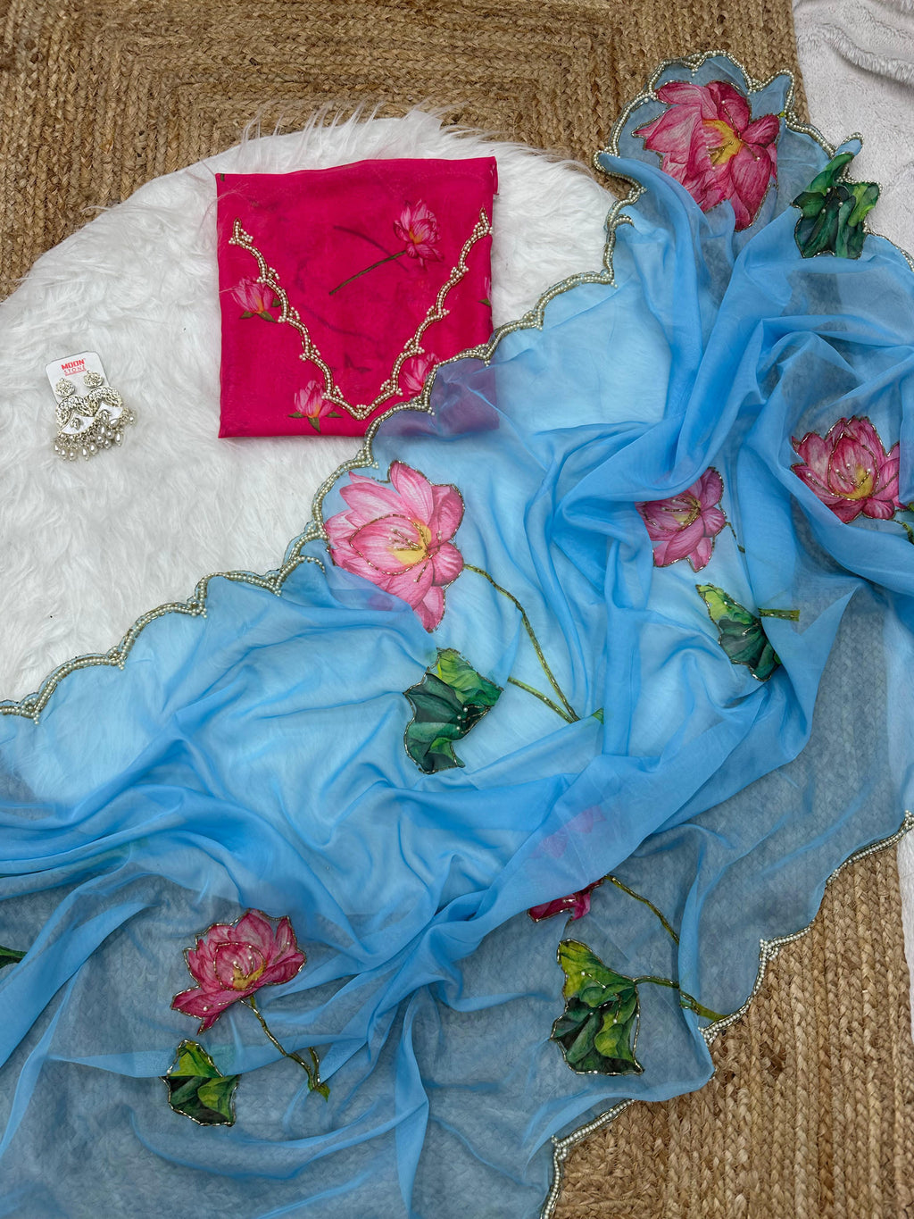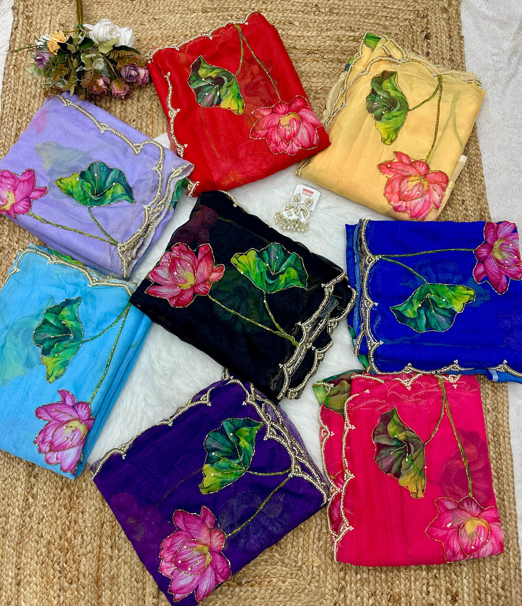 Ideal for festive celebrations, parties, and day events, this saree combines lightweight comfort with sophisticated style.
