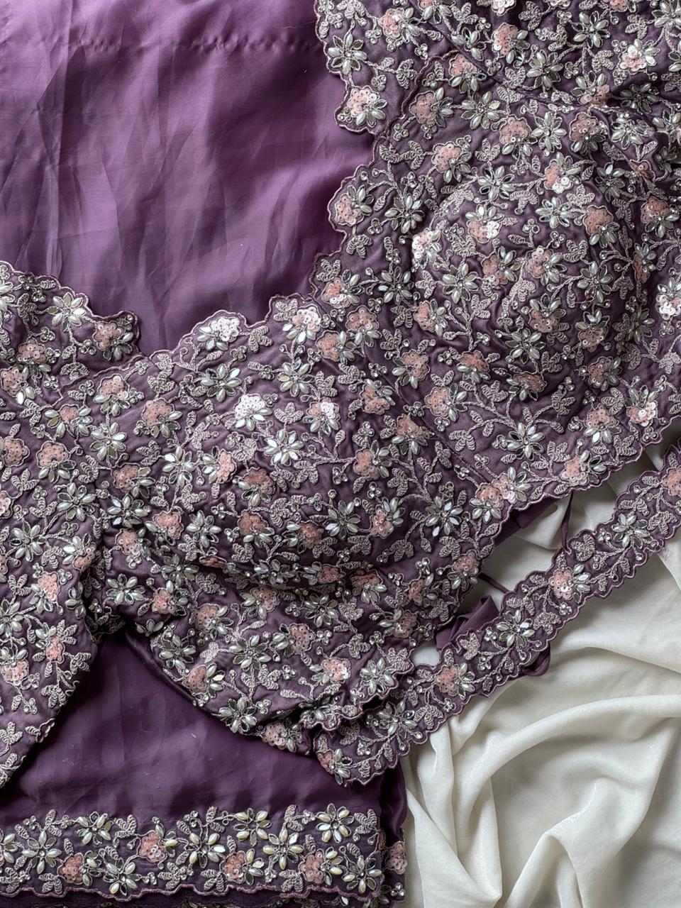Effortless elegance meets timeless charm with this Ready-to-Wear Space Silk Saree, designed for modern sophistication. Crafted from premium space silk, the saree features fully coded sequin and pearl work lace running along both borders, creating a refined shimmer with every movement.