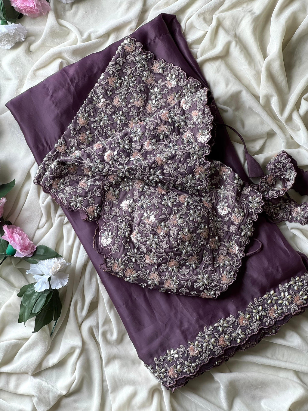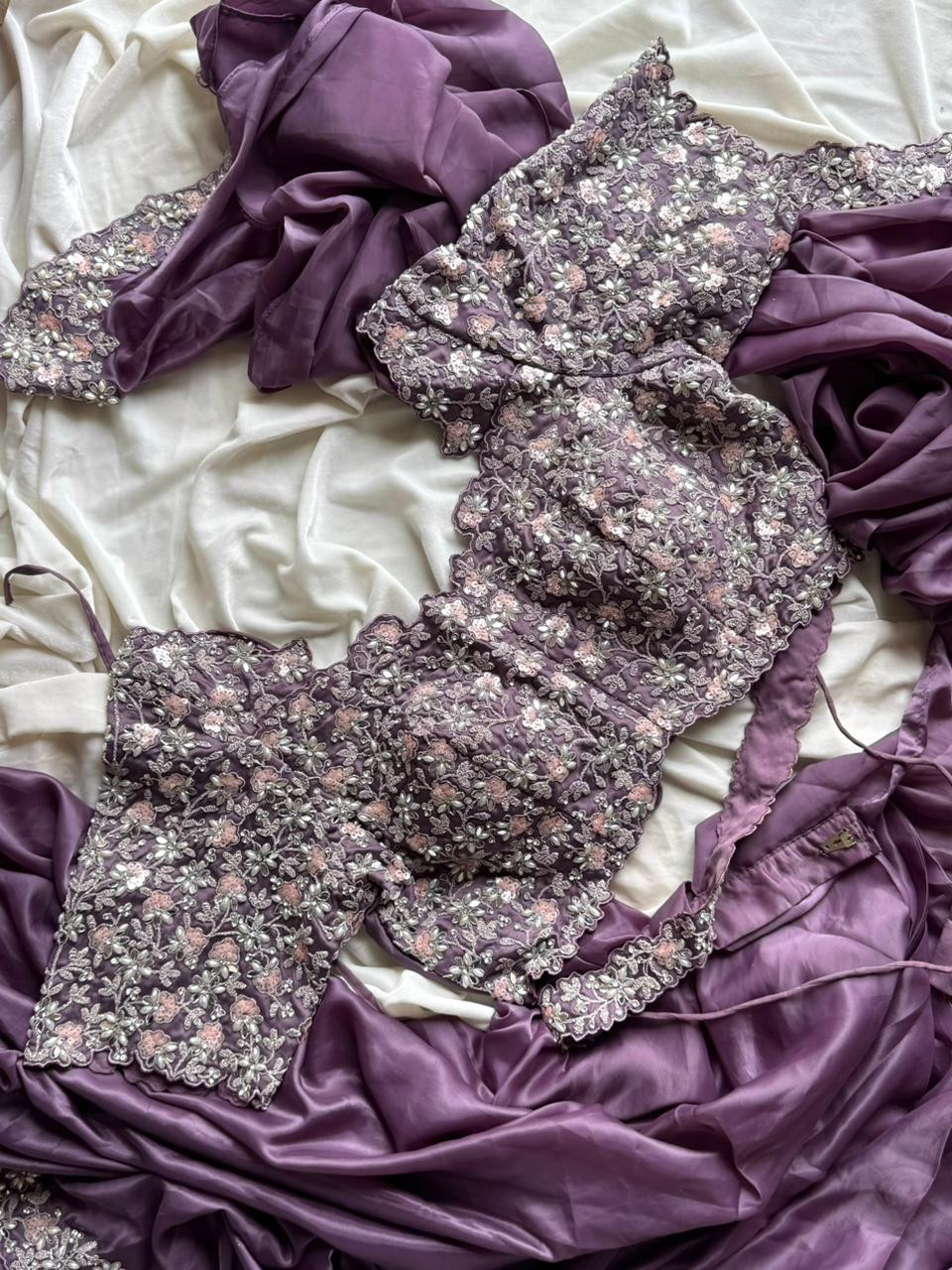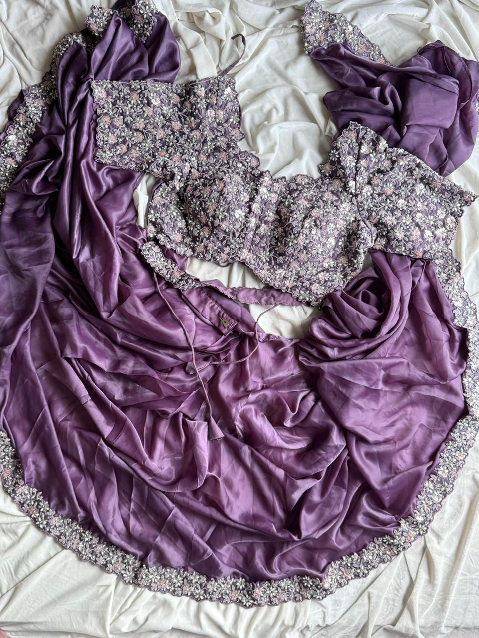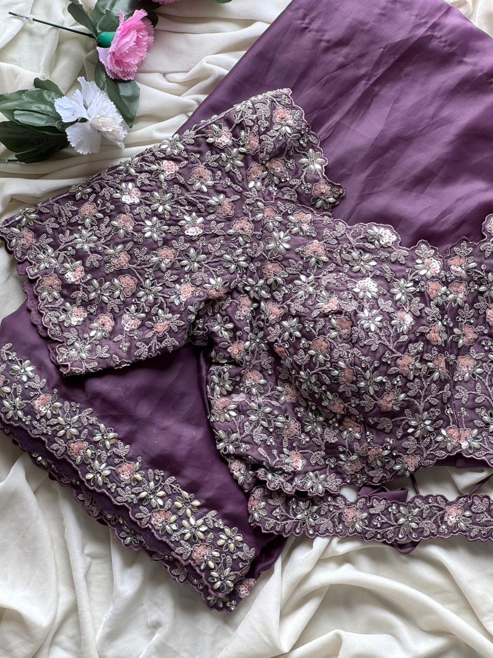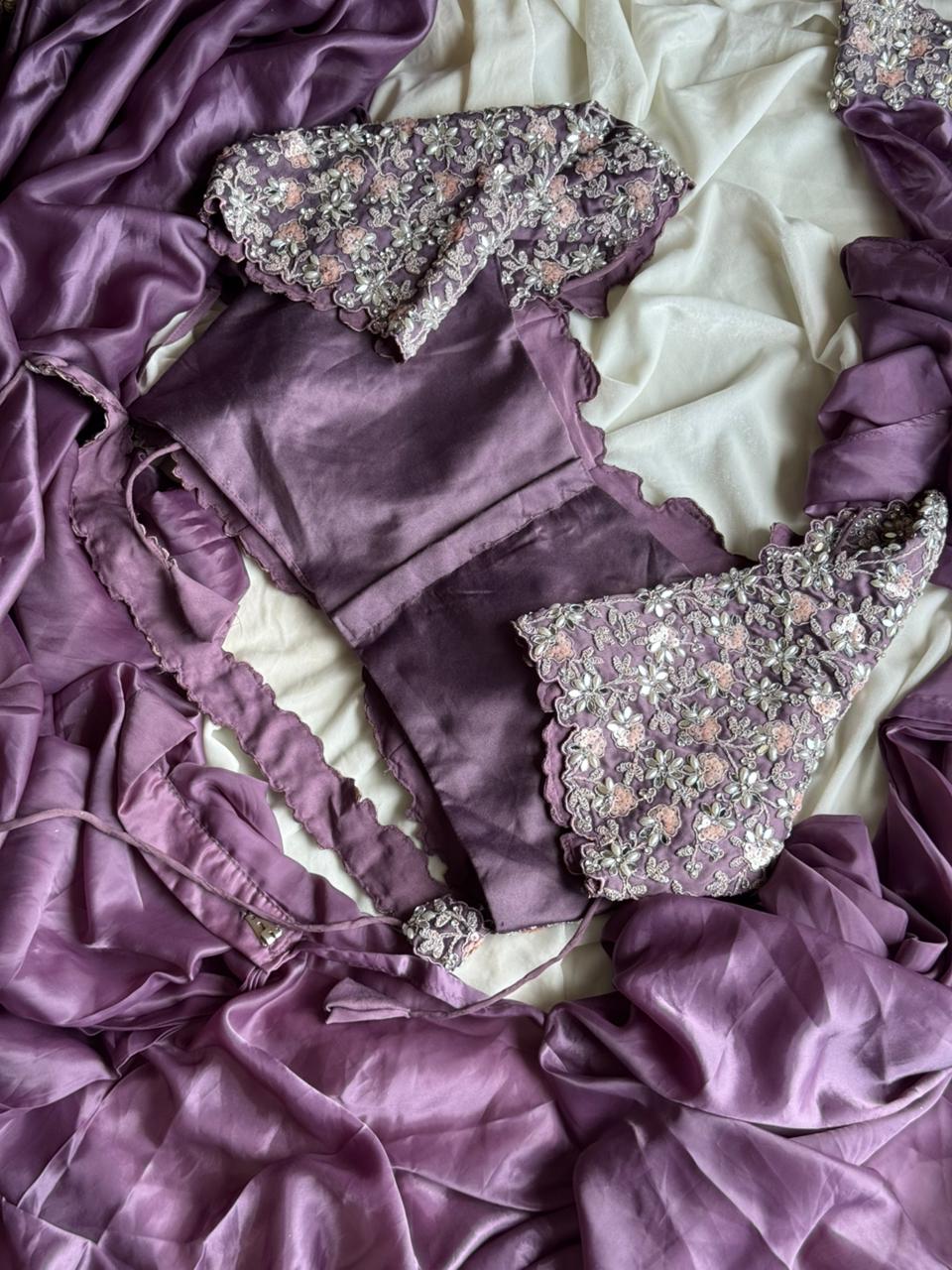 Paired with a fully stitched designer blouse adorned with matching sequin and pearl detailing, this ensemble is perfect for those who love convenience without compromising on luxury.