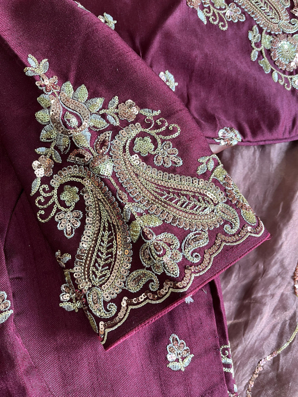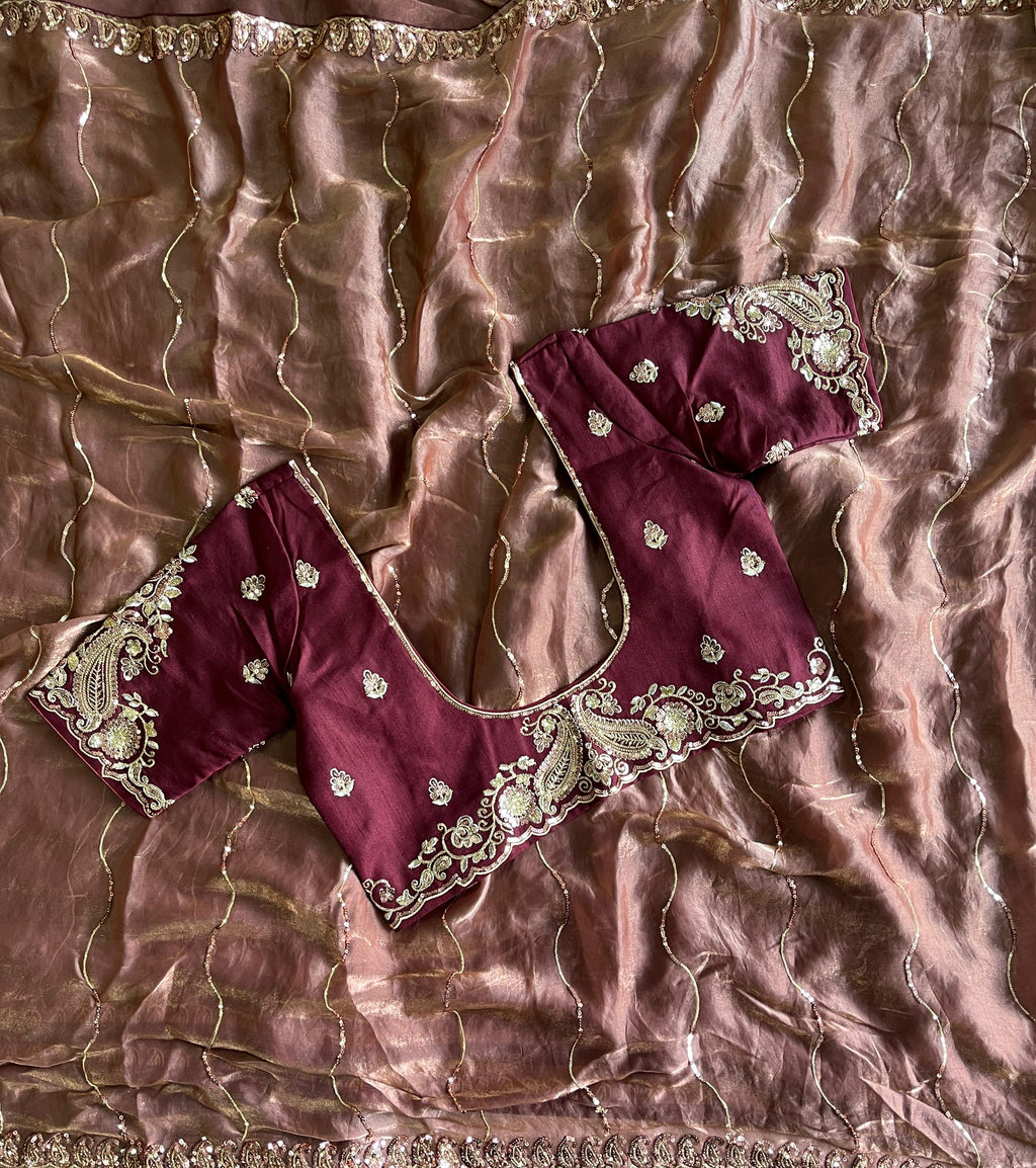The saree comes with a contrast designer stitched blouse, offering a perfect complement to the richly detailed drape. Custom measurements are available to ensure a flawless fit.