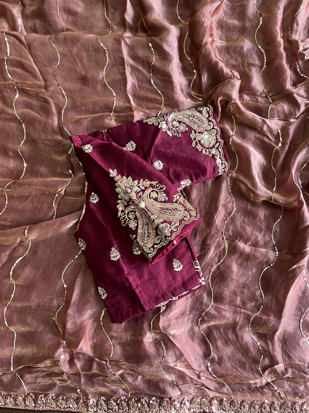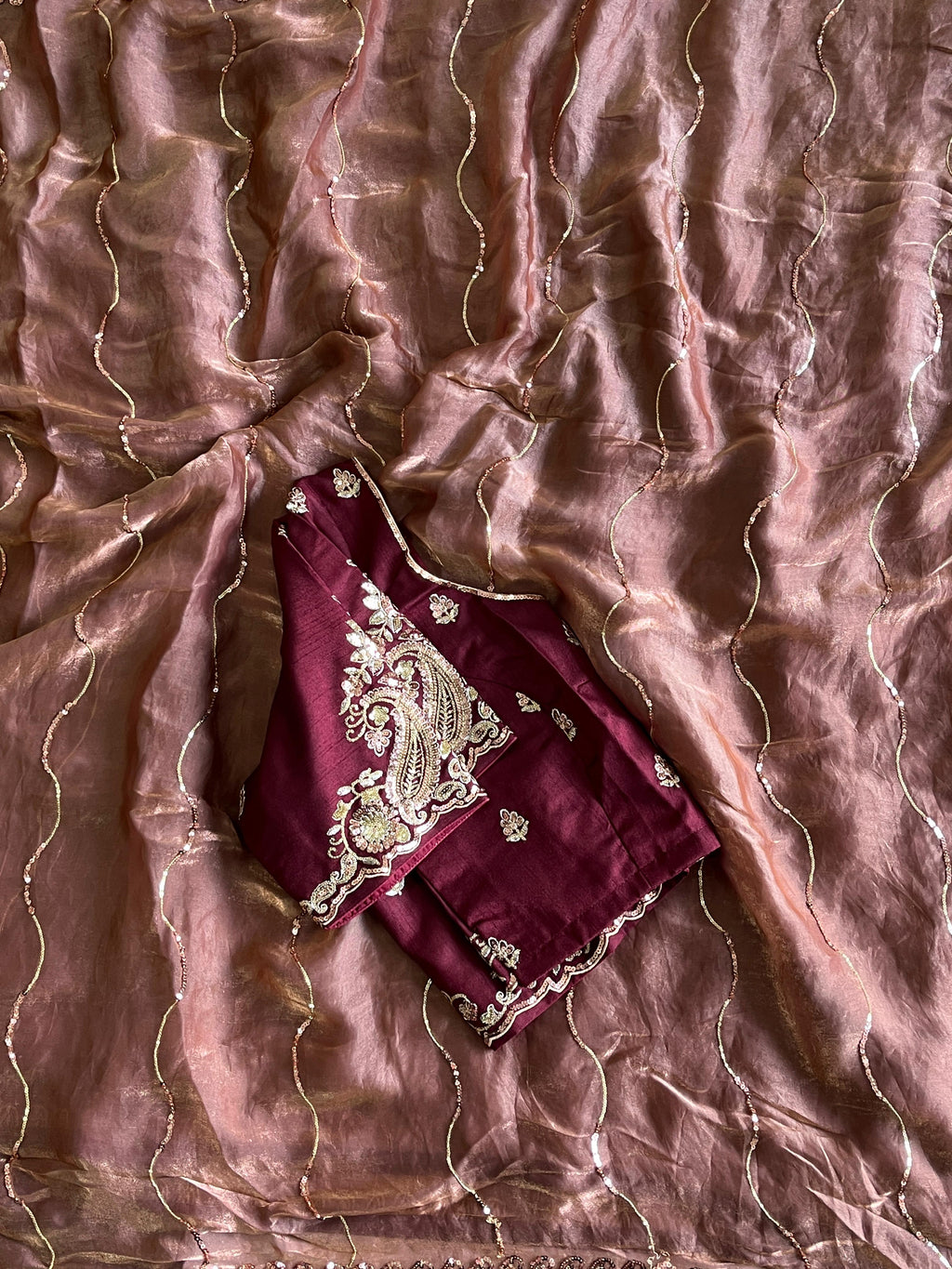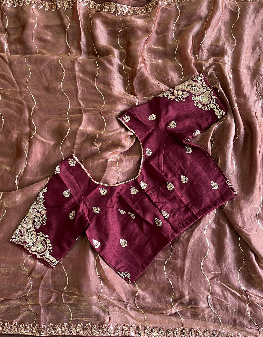 Step into a world of glamour with this premium space silk saree, crafted for an elegant and luxurious drape. The fabric is enhanced with intricate sequin work all over, adding a sparkling dimension that catches the light beautifully.