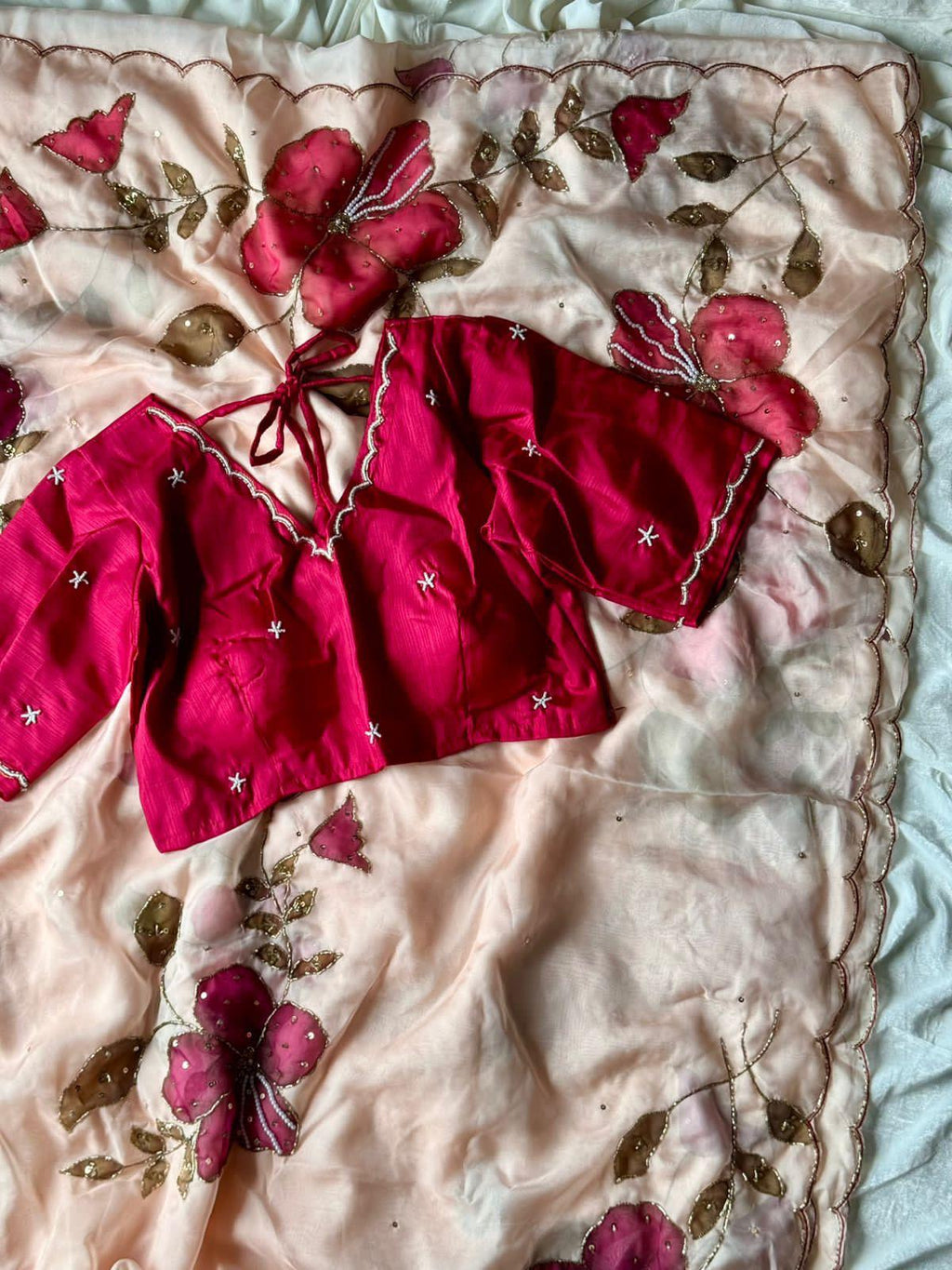 - Blouse: Banglori silk stitched blouse, fully handworked