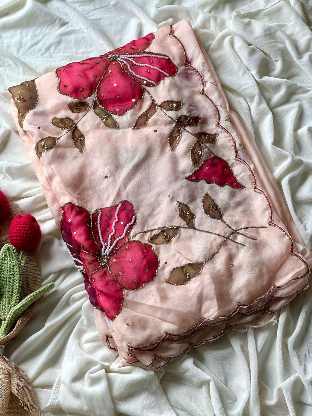 Drape yourself in effortless elegance with this Tebby Silk Designer Saree, crafted in soft, premium tebby silk for a smooth and luxurious fall. The saree features digital floral prints beautifully highlighted with intricate hand khatli, pearl, and sequin work, adding a subtle sparkle to your look.