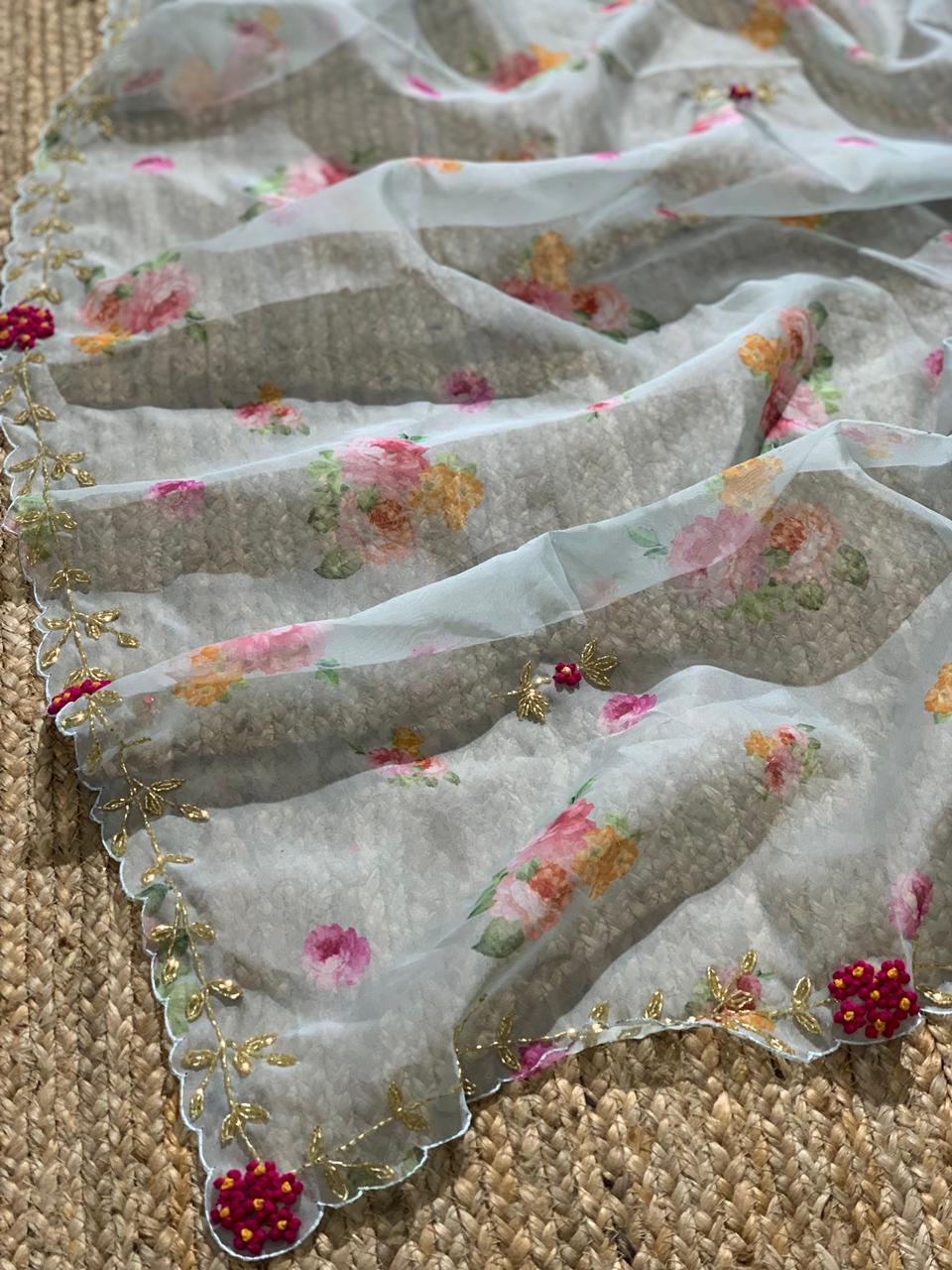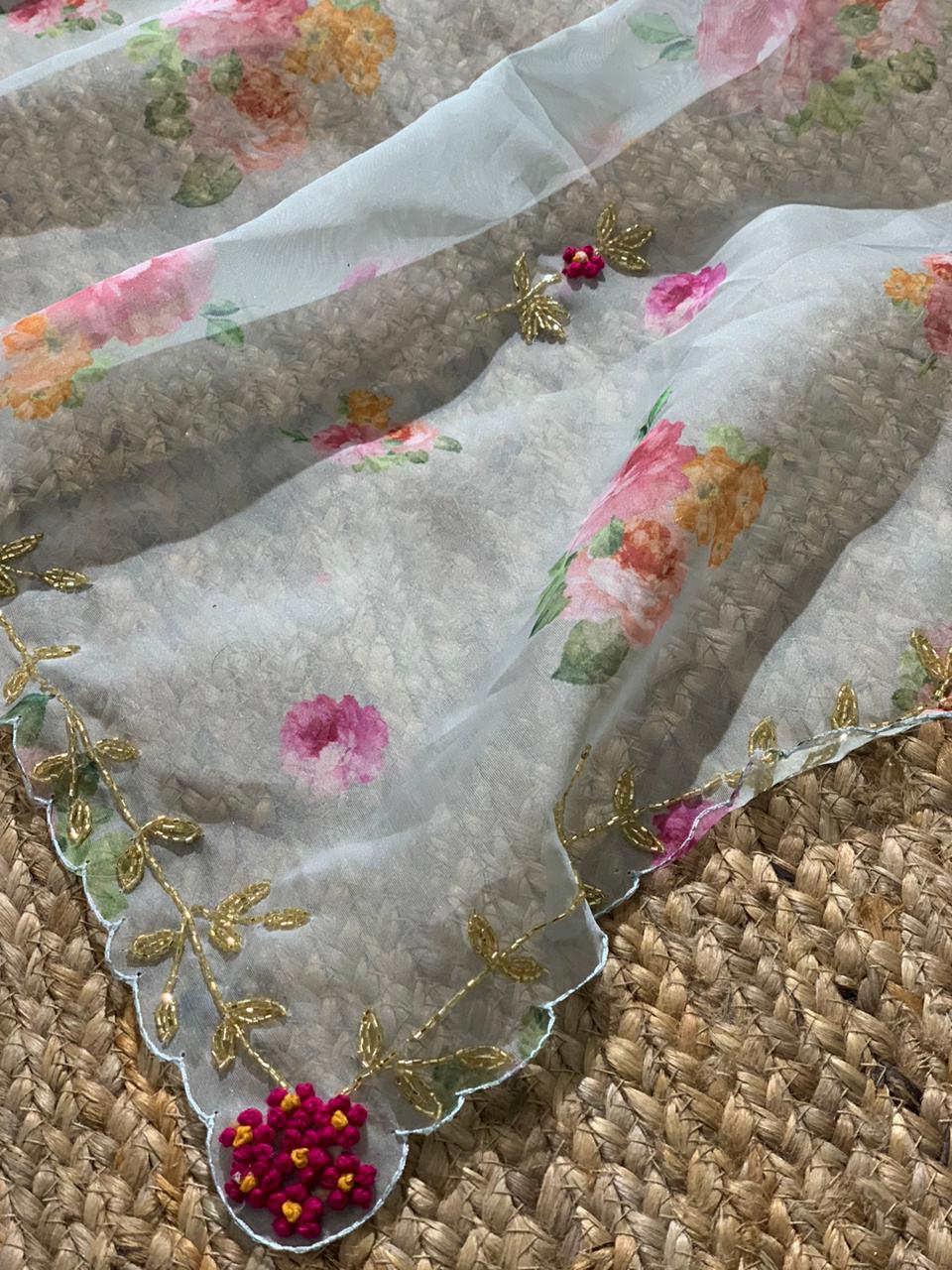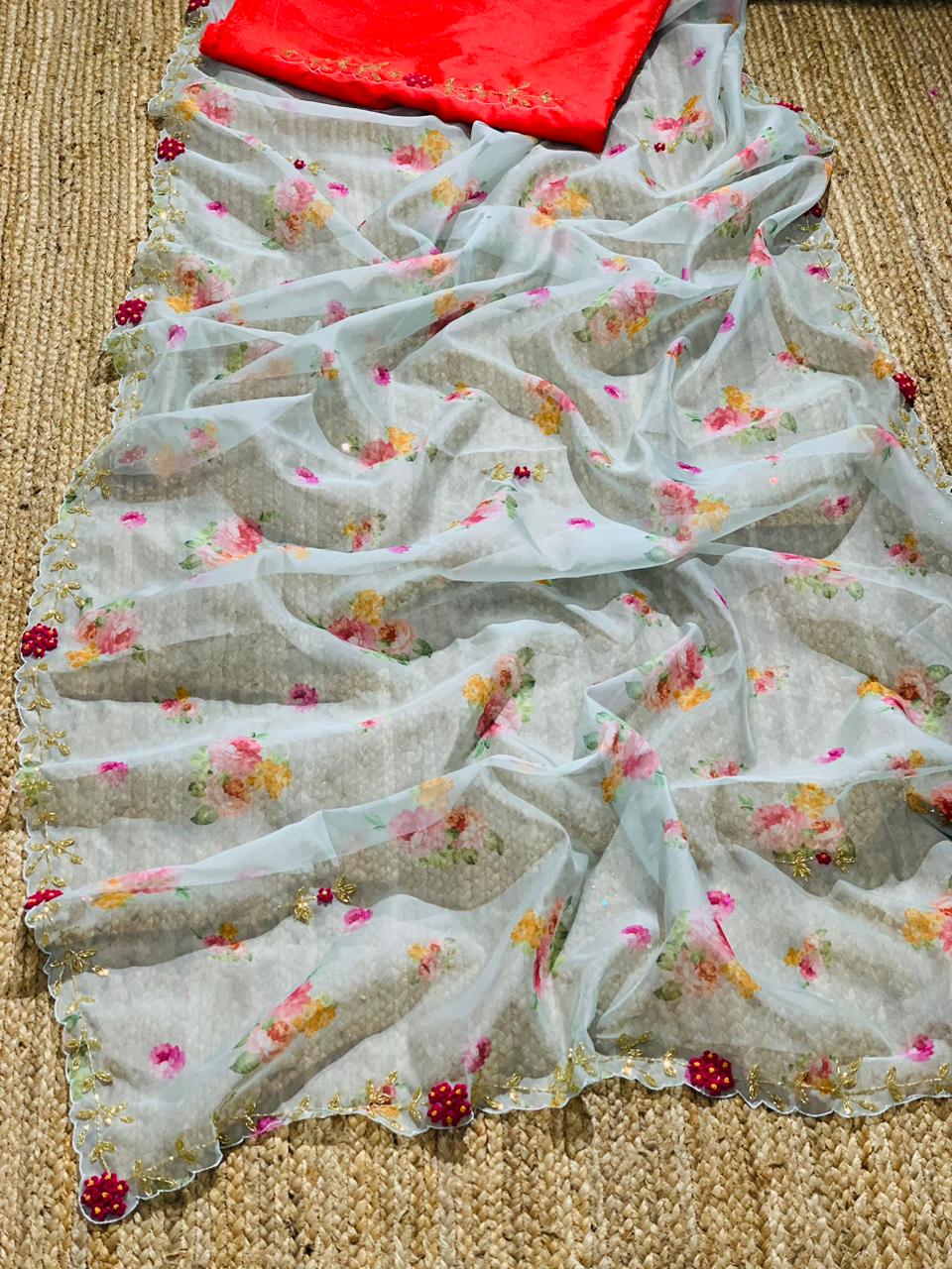 • Semi pure malai organza saree with beautiful print all over with hand crafted lucknowi and khatli work and red silk blouse with beautiful hand work