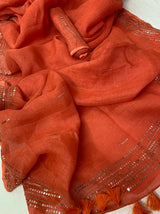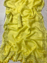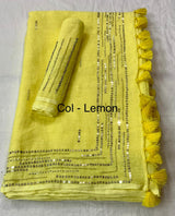 • Premium Collection of Hand crafted 120 count hand embroidered saree with handwork embroidery and tassels on the border with similar running pallu and unstitched blouse.