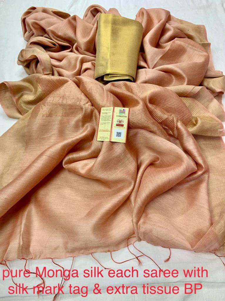 Pure linen, Pure munga tussar silk saree with running blouse piece and golden tissue silk