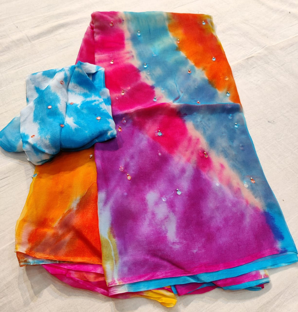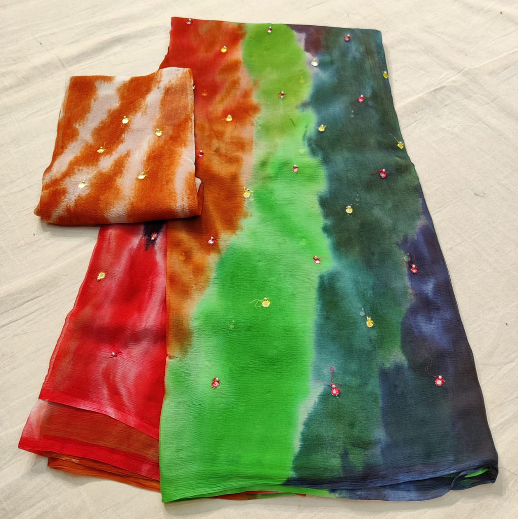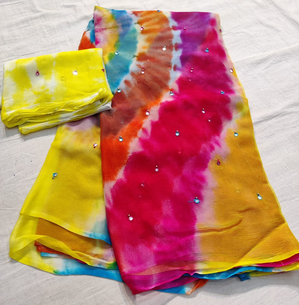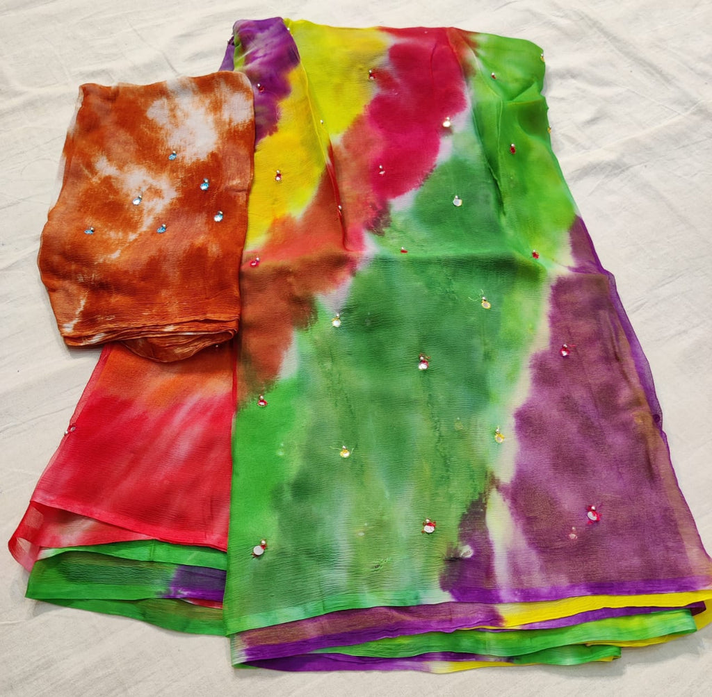 - New and Elegant diamond chiffon saree with beautiful tie and dye print with mirror work all over the saree and is paired with matching similar and Fancy unstitched blouse.
