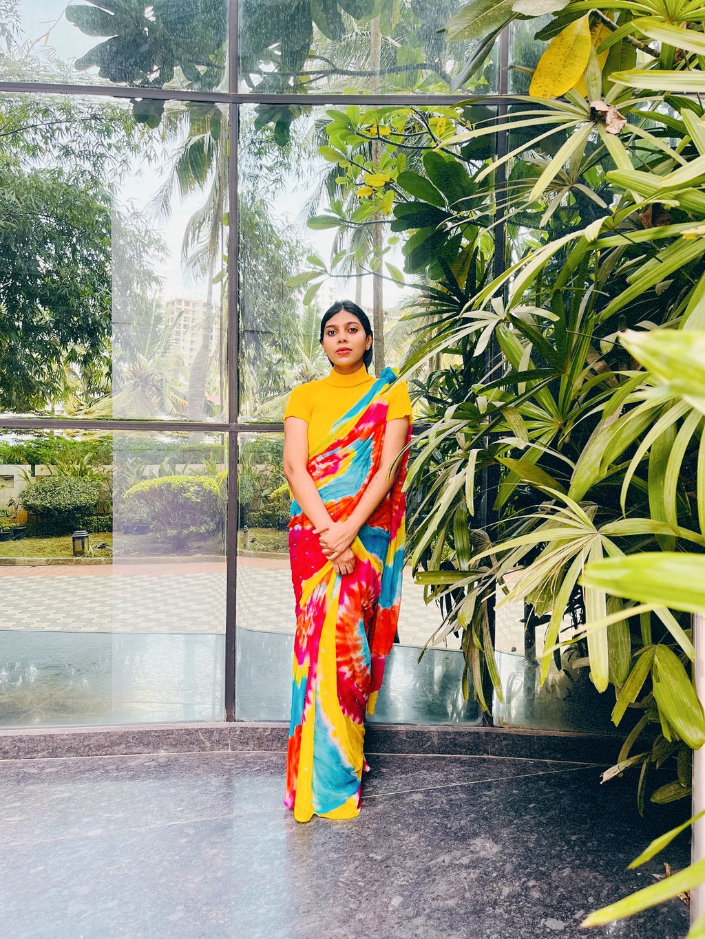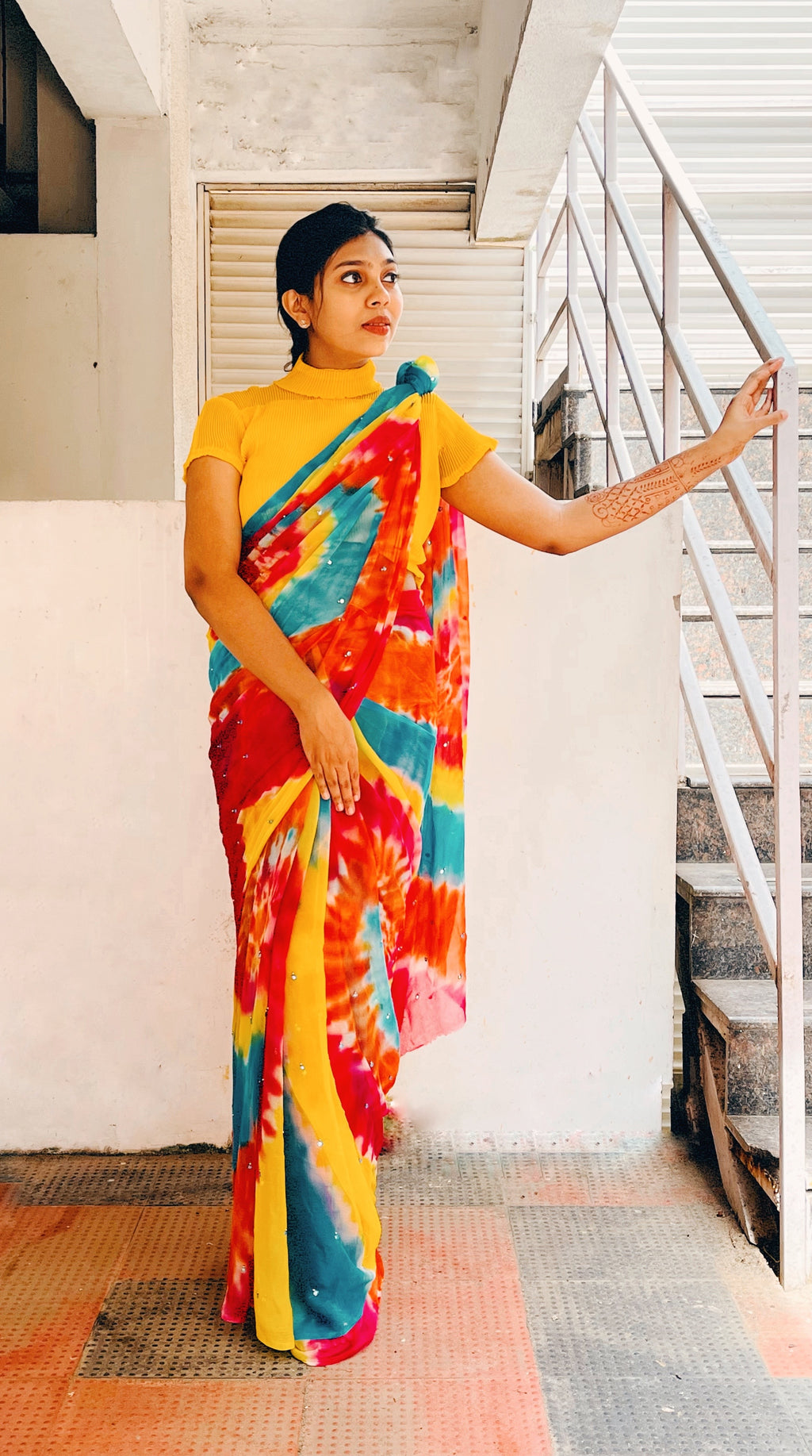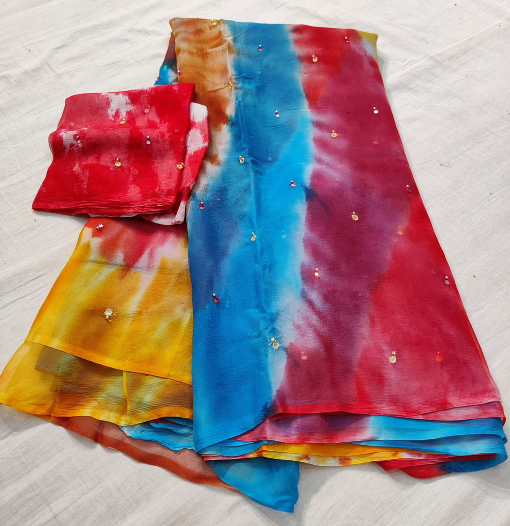 - New and Elegant diamond chiffon saree with beautiful tie and dye print with mirror work all over the saree and is paired with matching similar and Fancy unstitched blouse.
