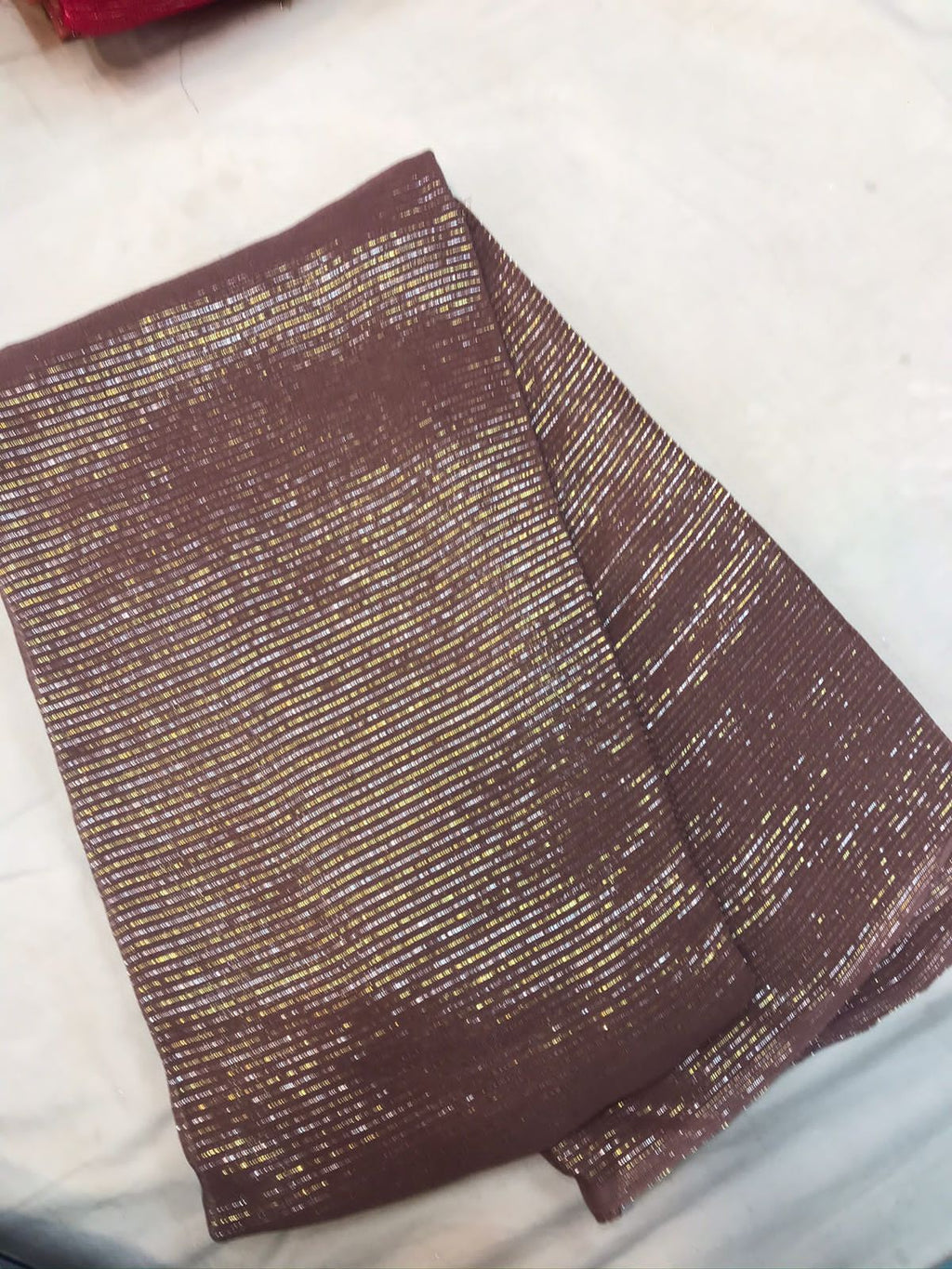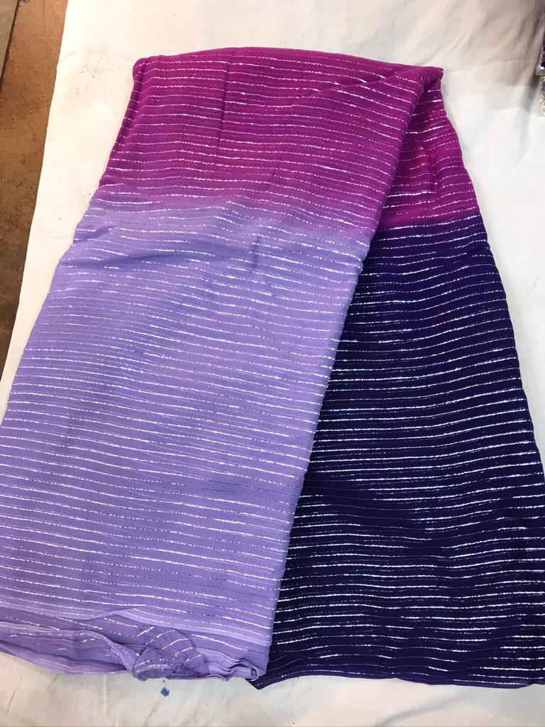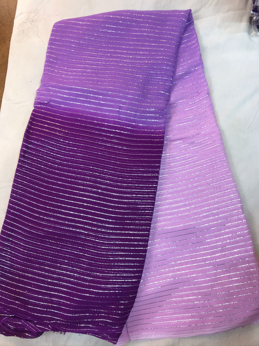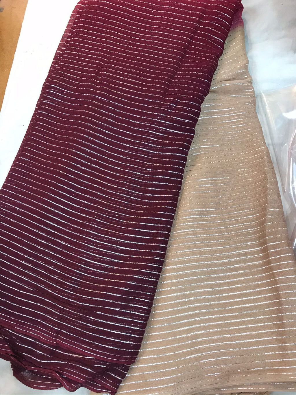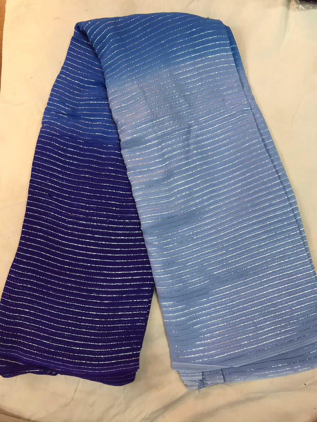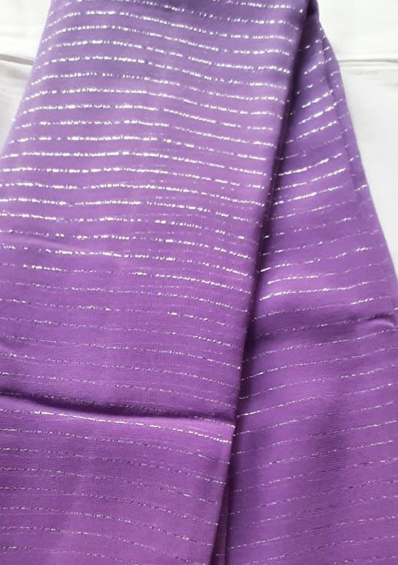 • The modern looking pure Georgette saree is having an elegant silver zari lurex lines design all over the saree. The complementary sequins blouse gives this saree a stylish look.