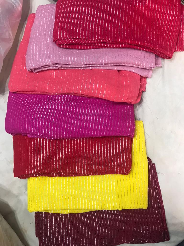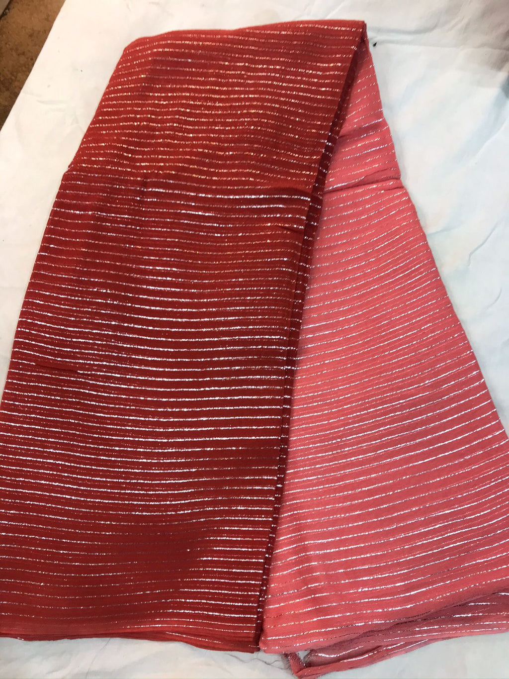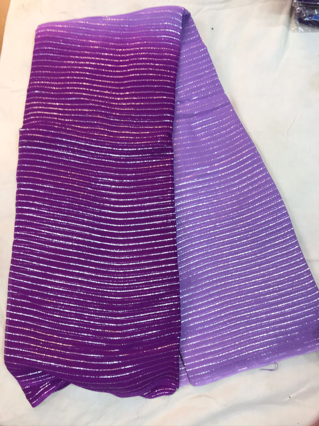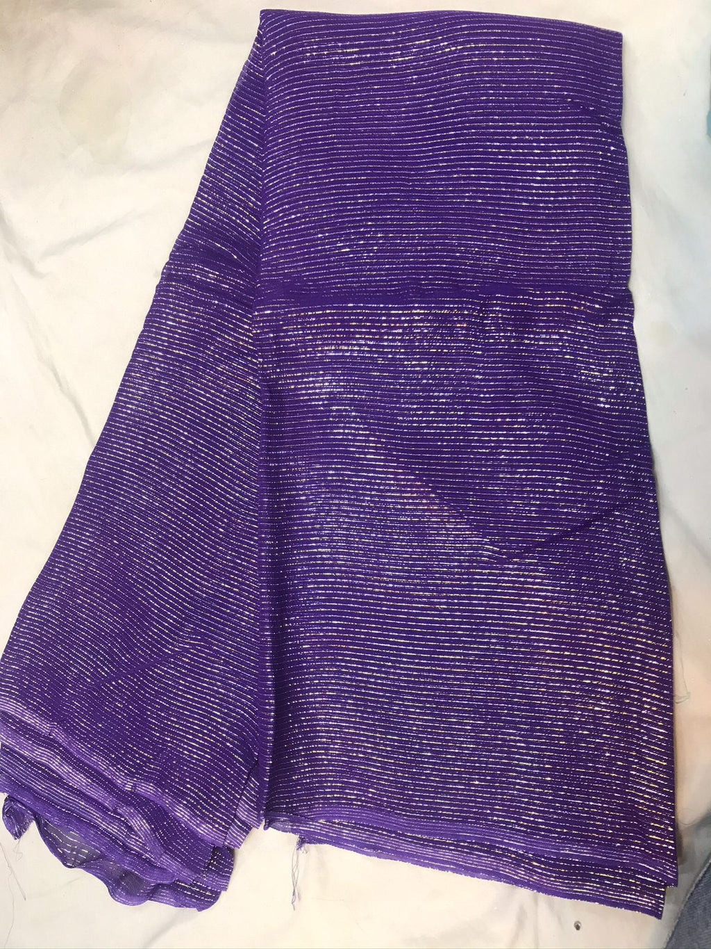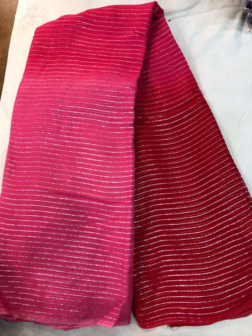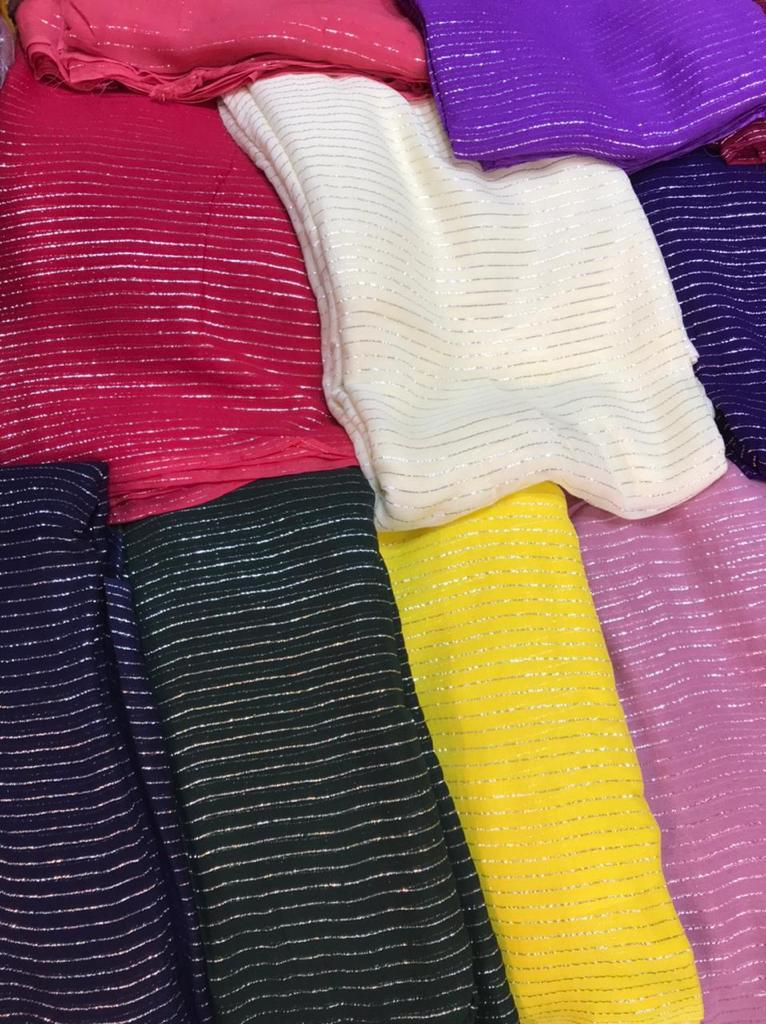 • The modern looking pure Georgette saree is having an elegant silver zari lurex lines design all over the saree. The complementary sequins blouse gives this saree a stylish look.
