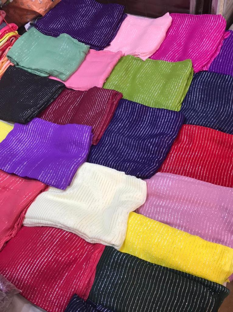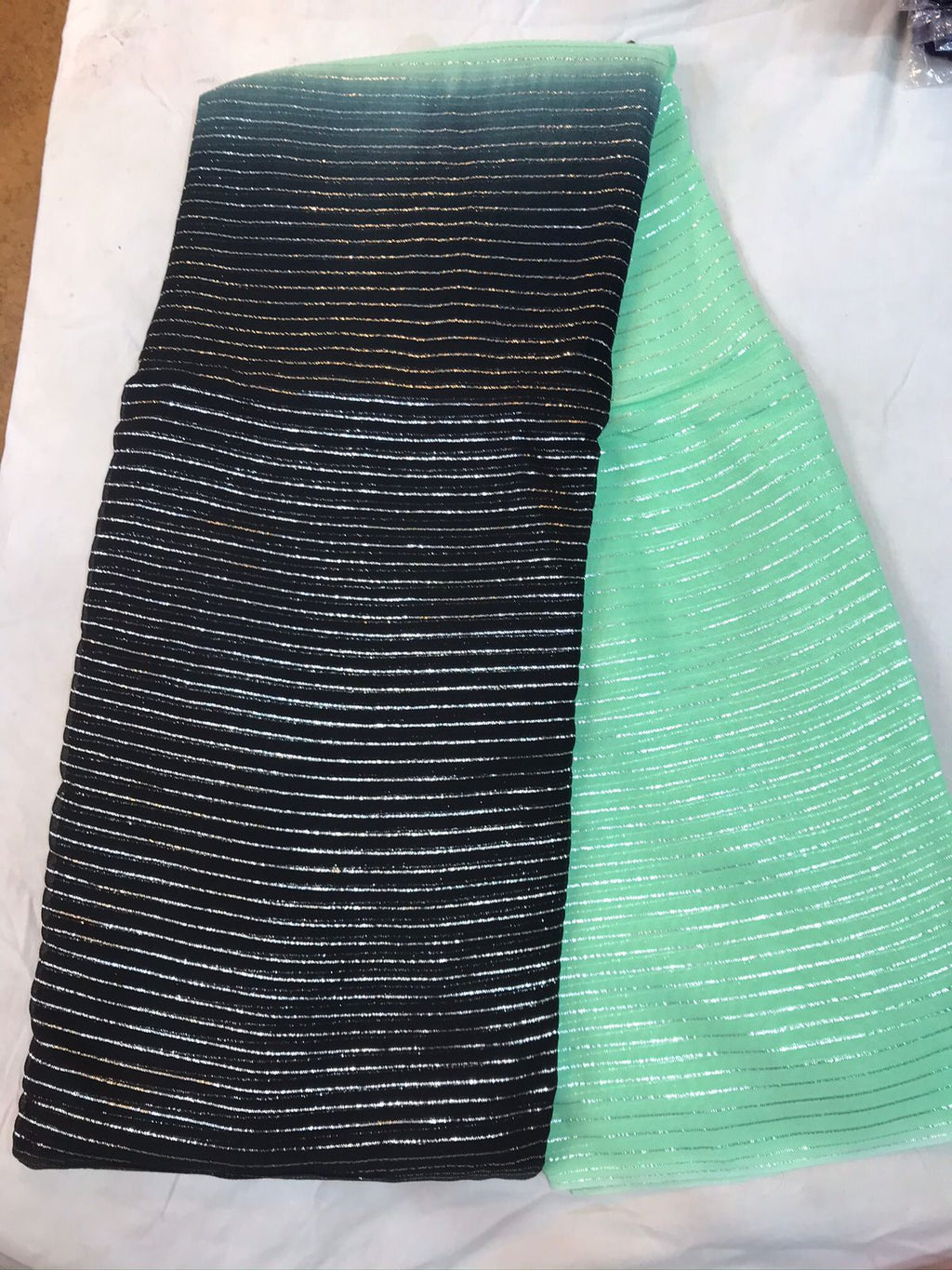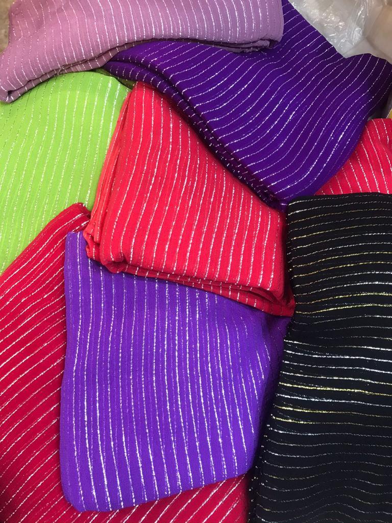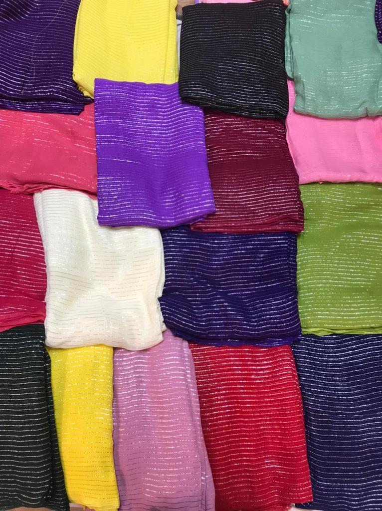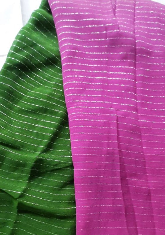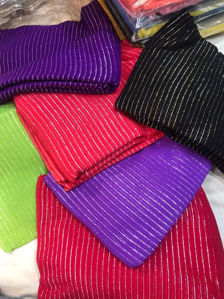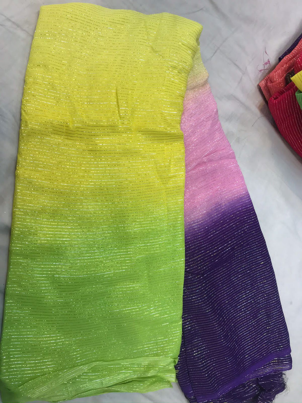 • The modern looking pure Georgette saree is having an elegant silver zari lurex lines design all over the saree. The complementary sequins blouse gives this saree a stylish look.