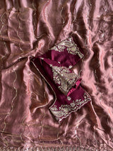 The saree comes with a contrast designer stitched blouse, offering a perfect complement to the richly detailed drape. Custom measurements are available to ensure a flawless fit.