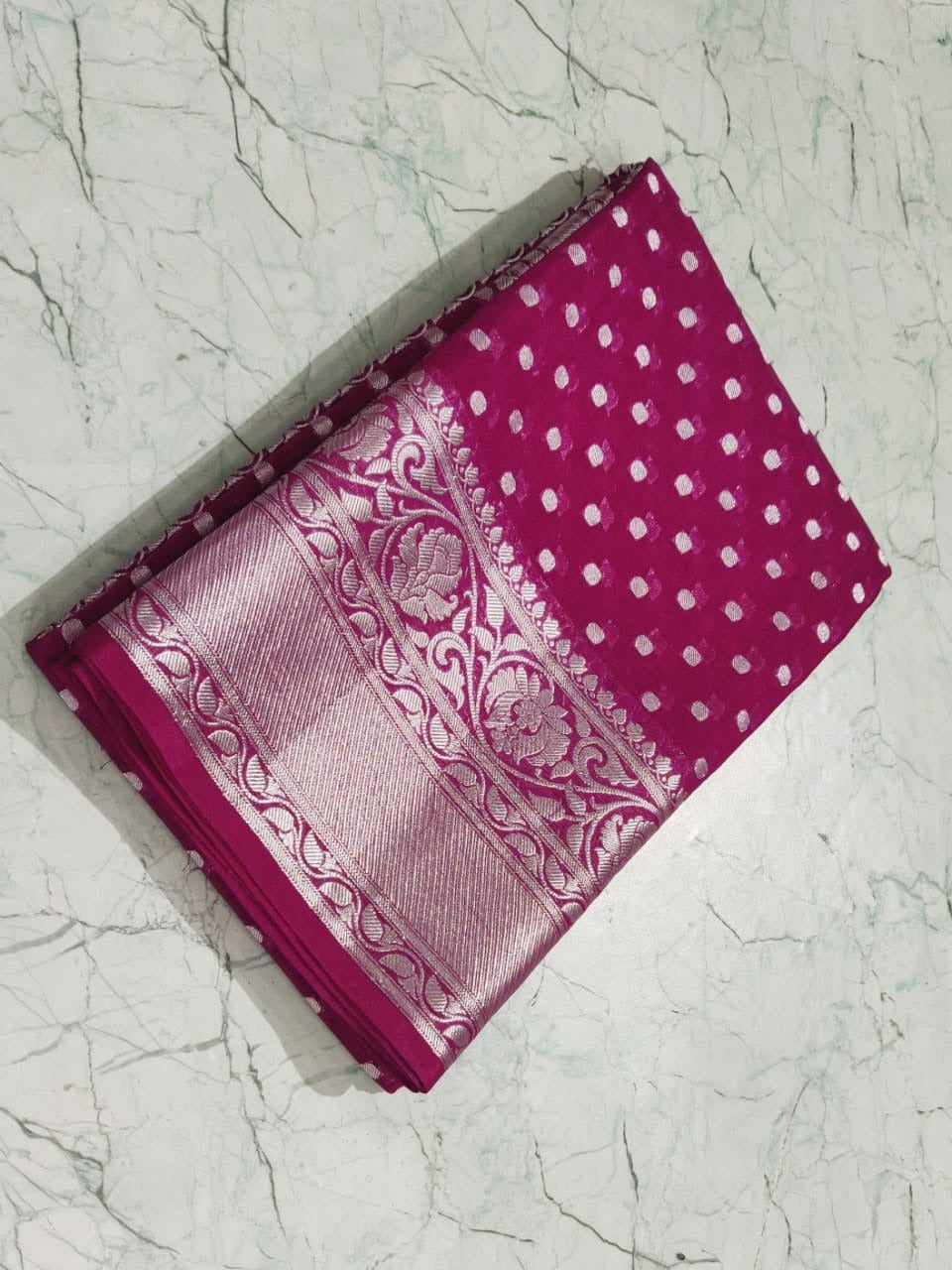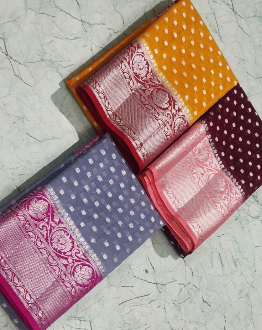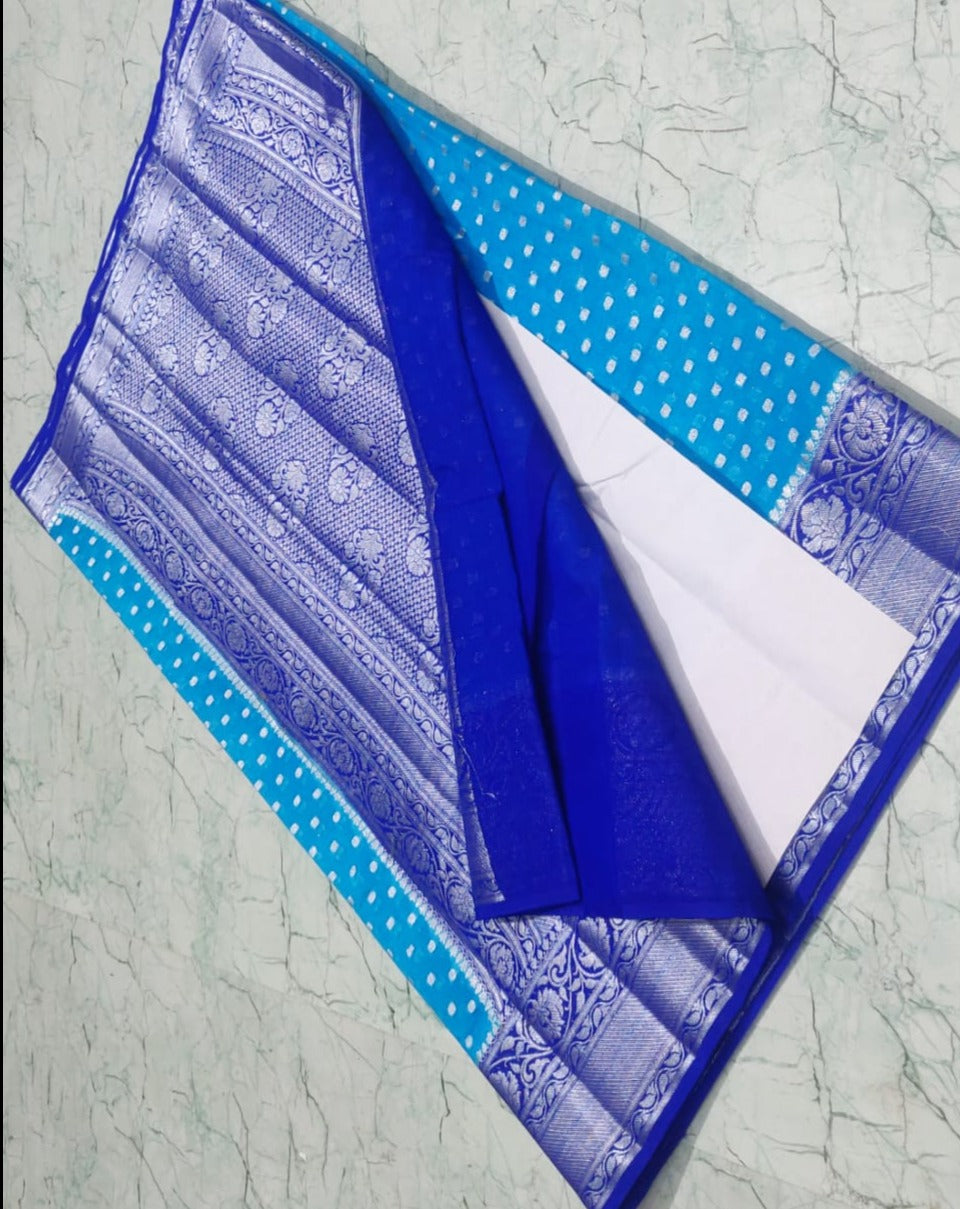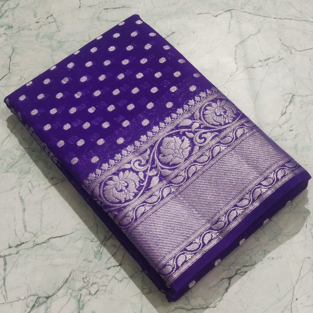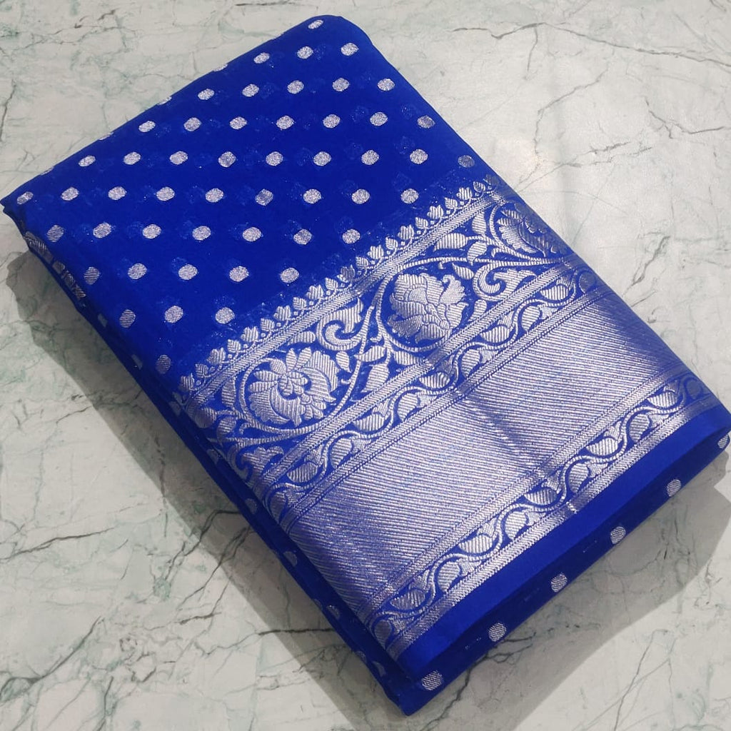 • New Collection of Banarasi Semi Georgette Silk saree with beautiful Silver zari weaving work on all over saree and rich heavy zari contrast border and pallu. It is paired with running unstitched blouse.