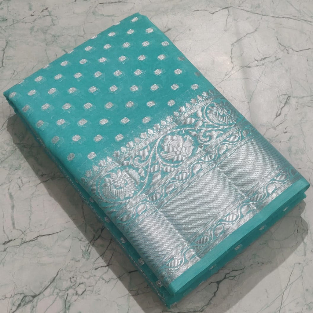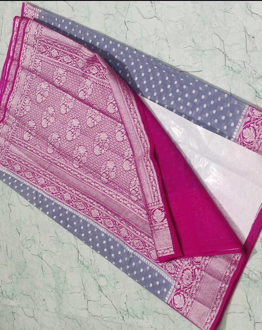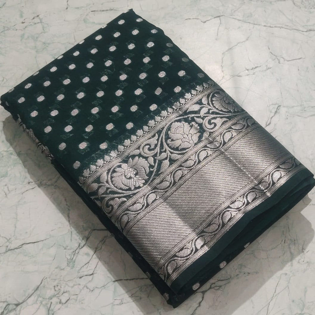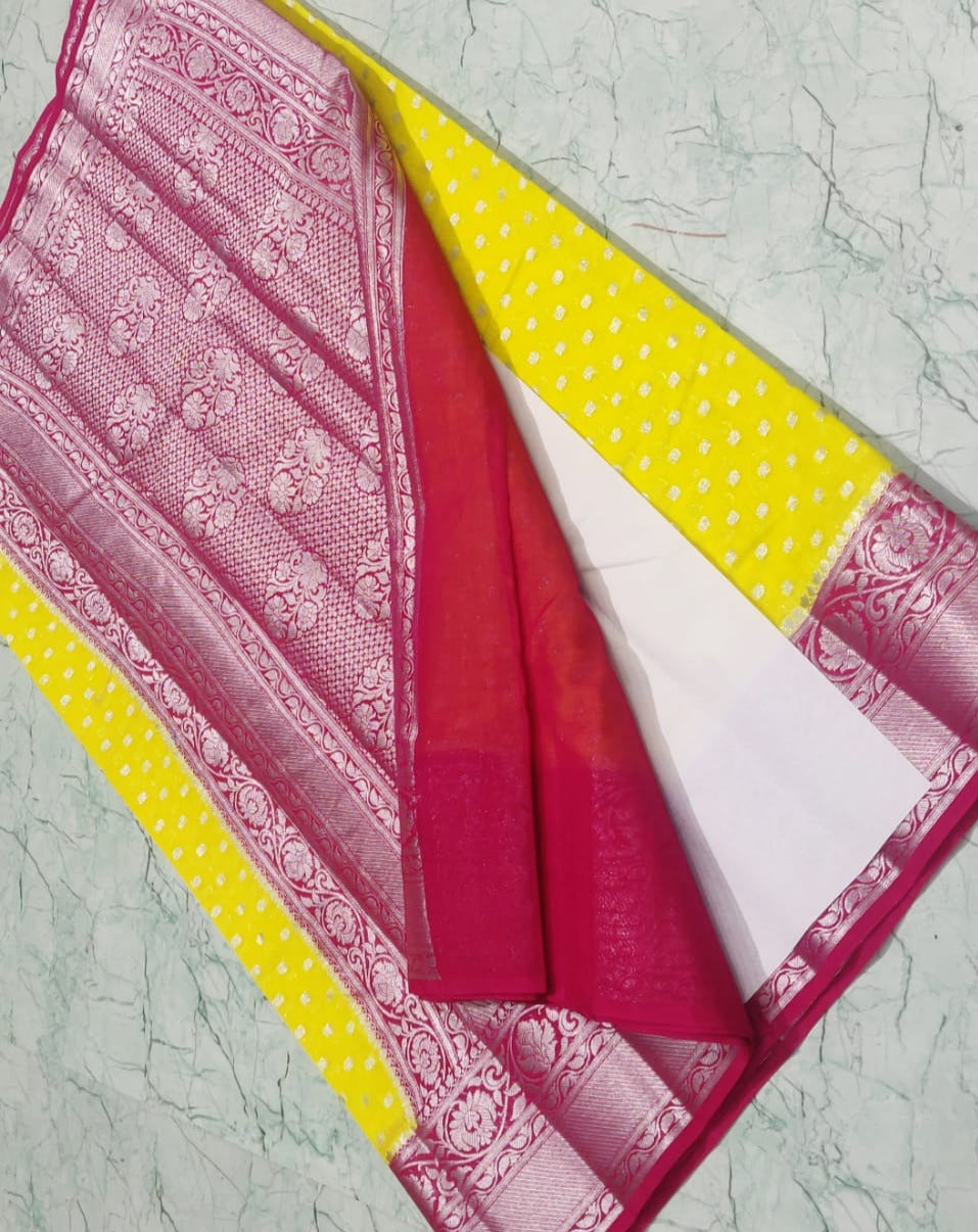 • New Collection of Banarasi Semi Georgette Silk saree with beautiful Silver zari weaving work on all over saree and rich heavy zari contrast border and pallu. It is paired with running unstitched blouse.