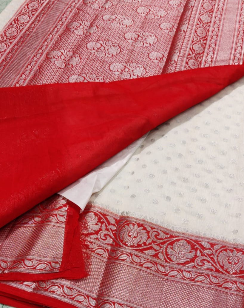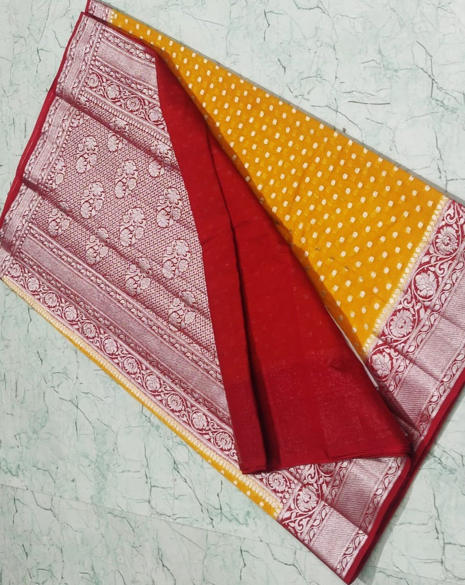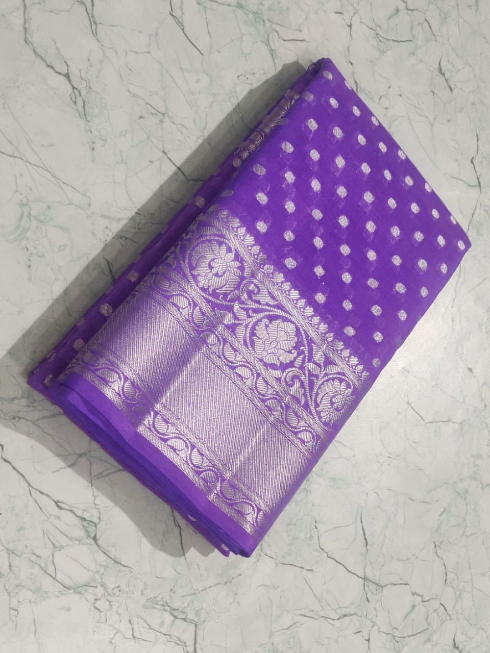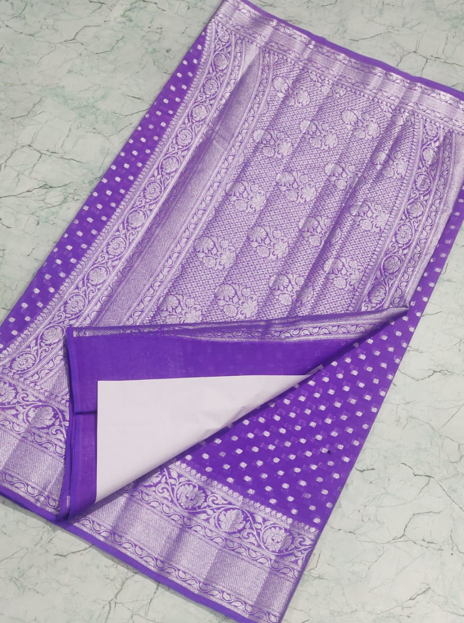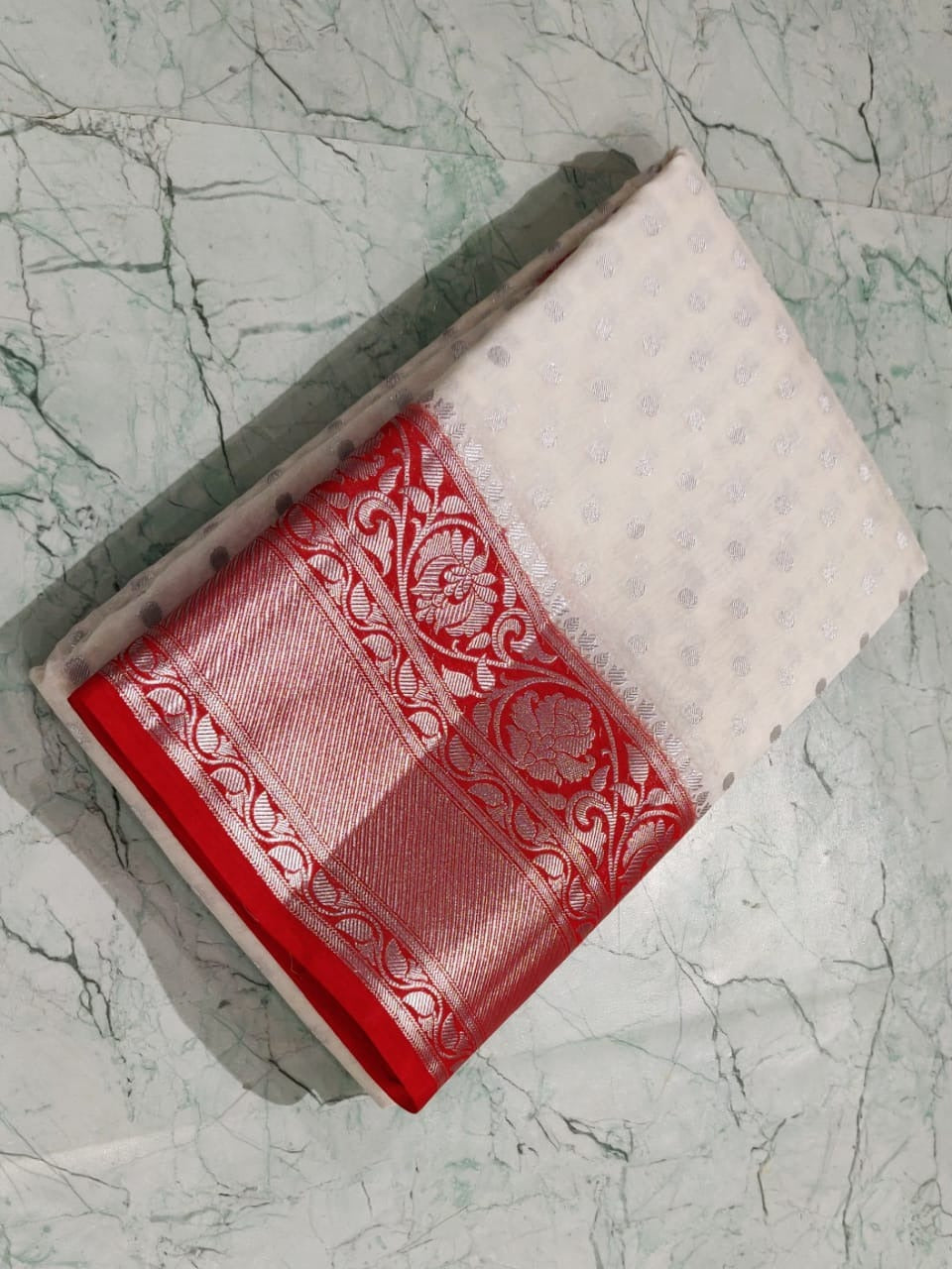 • New Collection of Banarasi Semi Georgette Silk saree with beautiful Silver zari weaving work on all over saree and rich heavy zari contrast border and pallu. It is paired with running unstitched blouse.