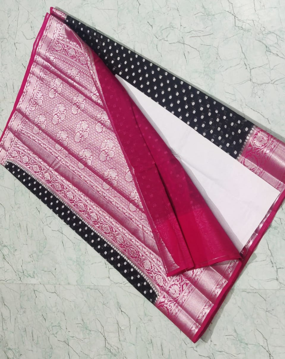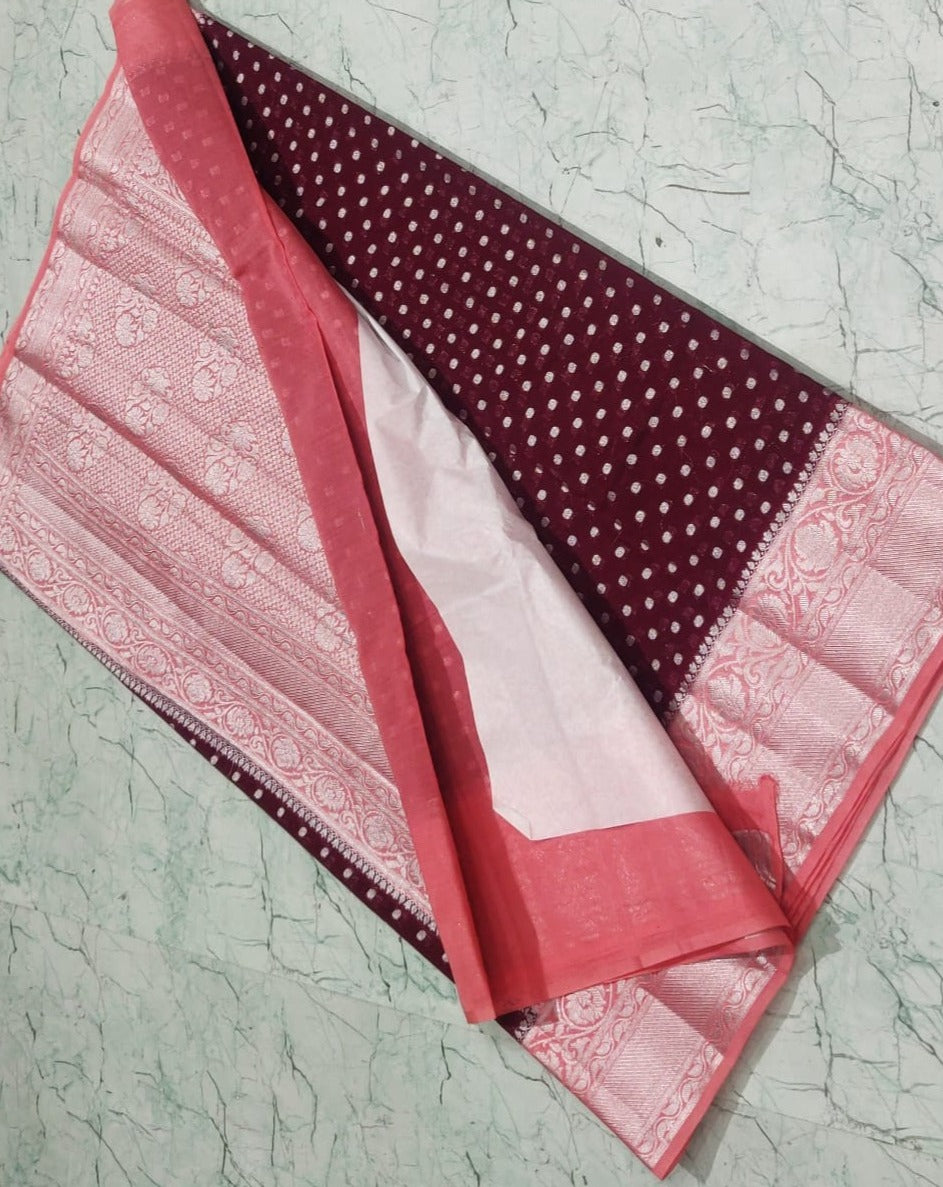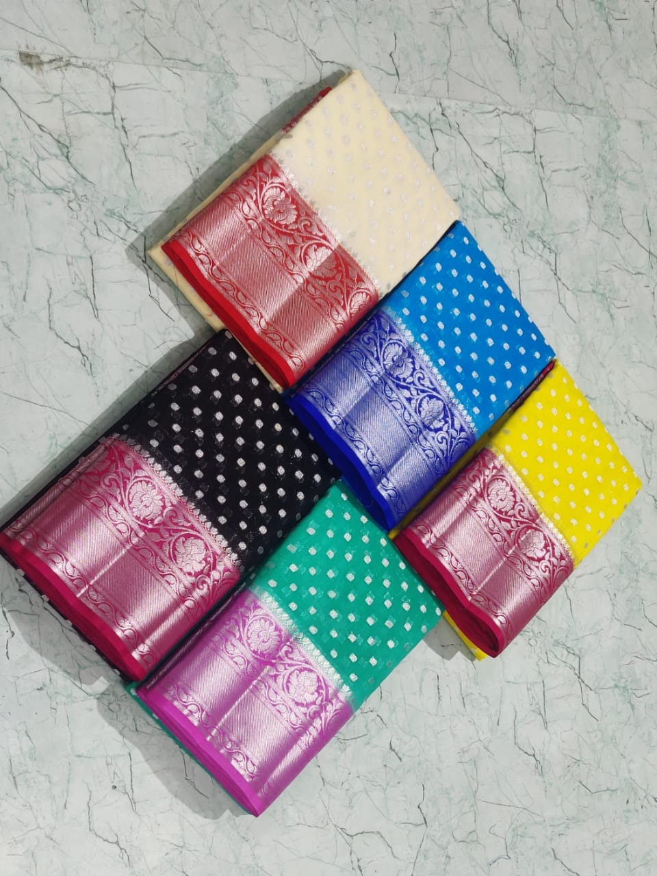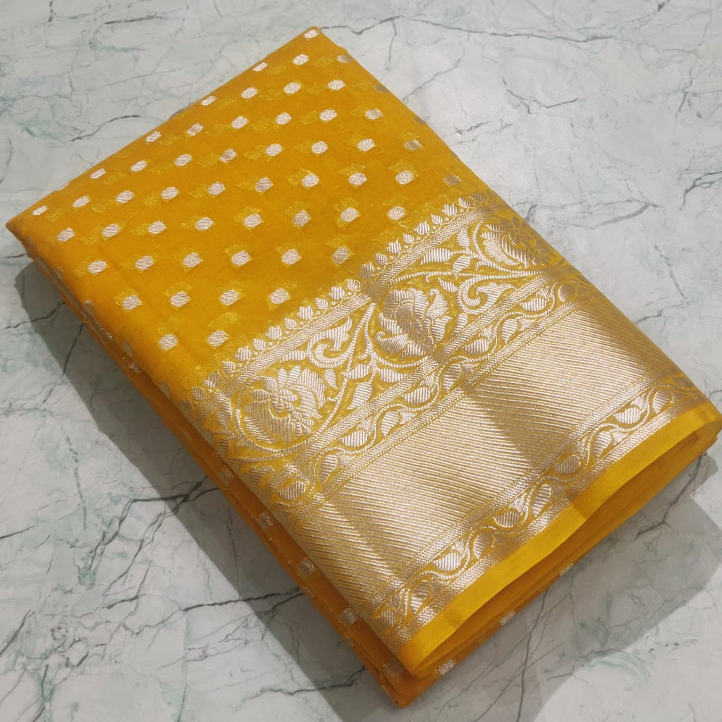• New Collection of Banarasi Semi Georgette Silk saree with beautiful Silver zari weaving work on all over saree and rich heavy zari contrast border and pallu. It is paired with running unstitched blouse.