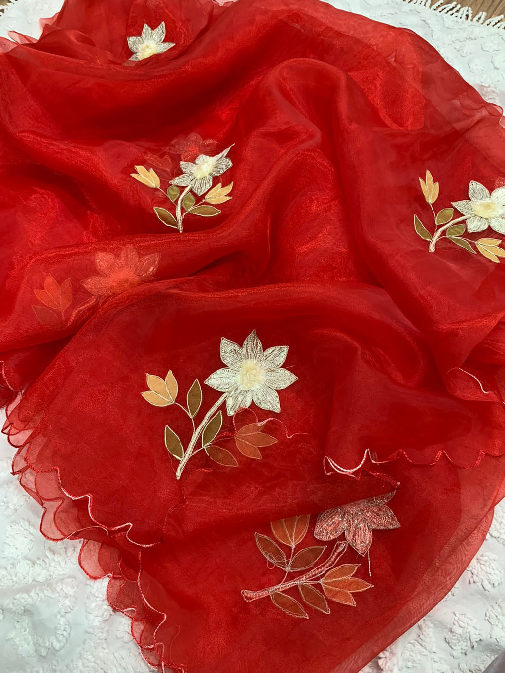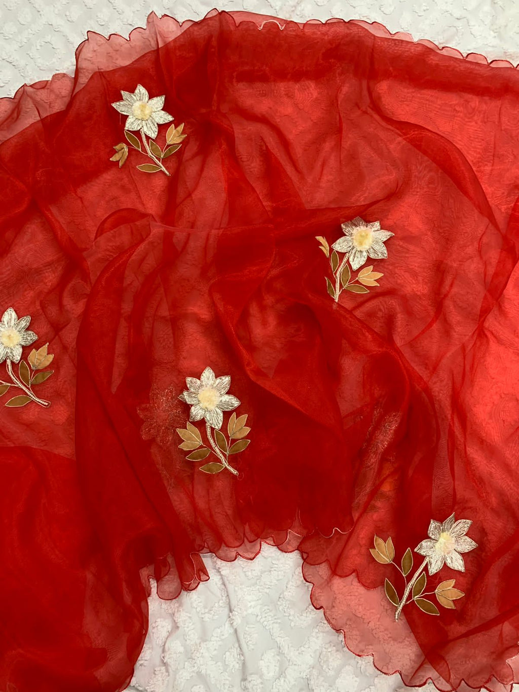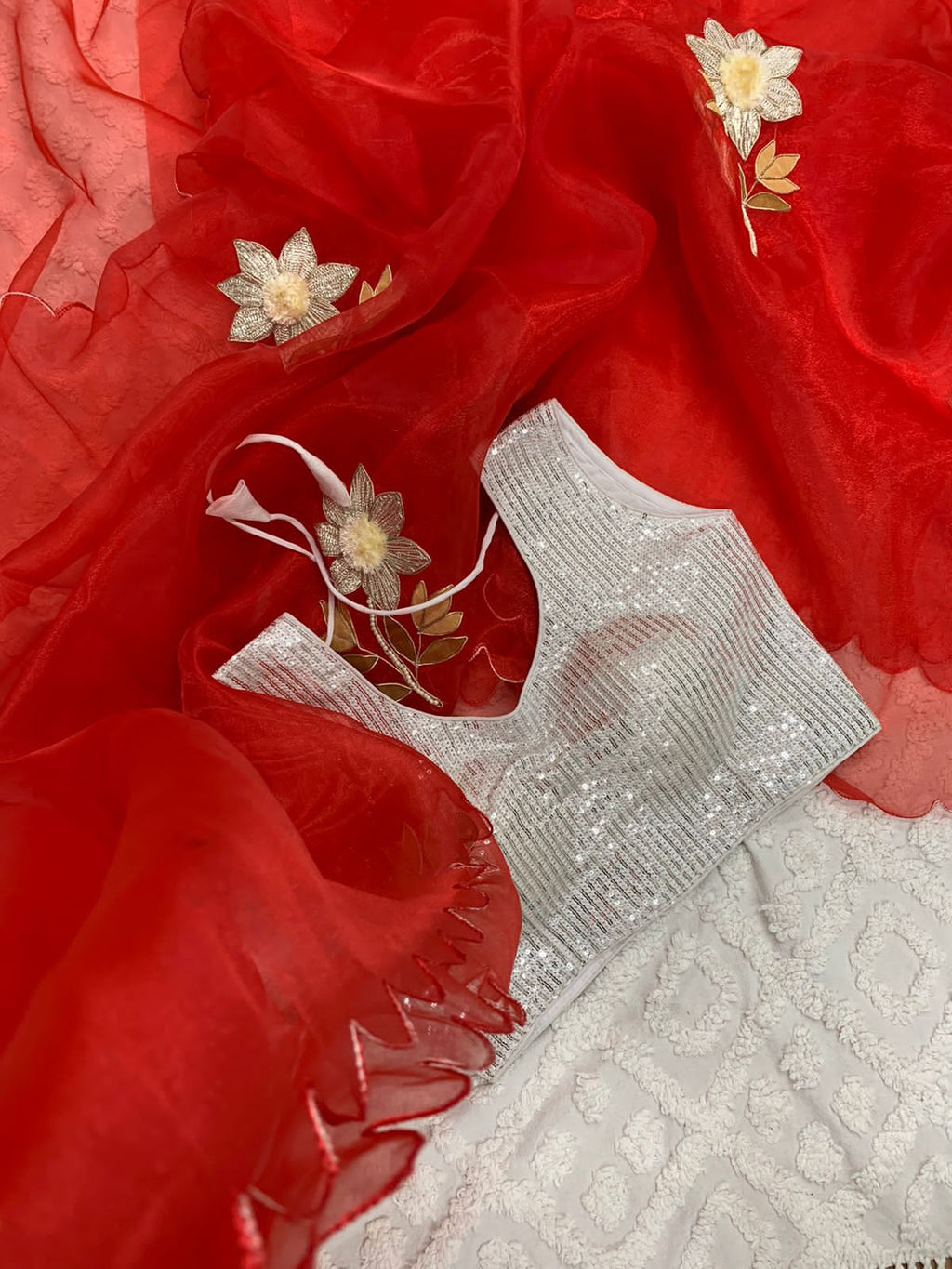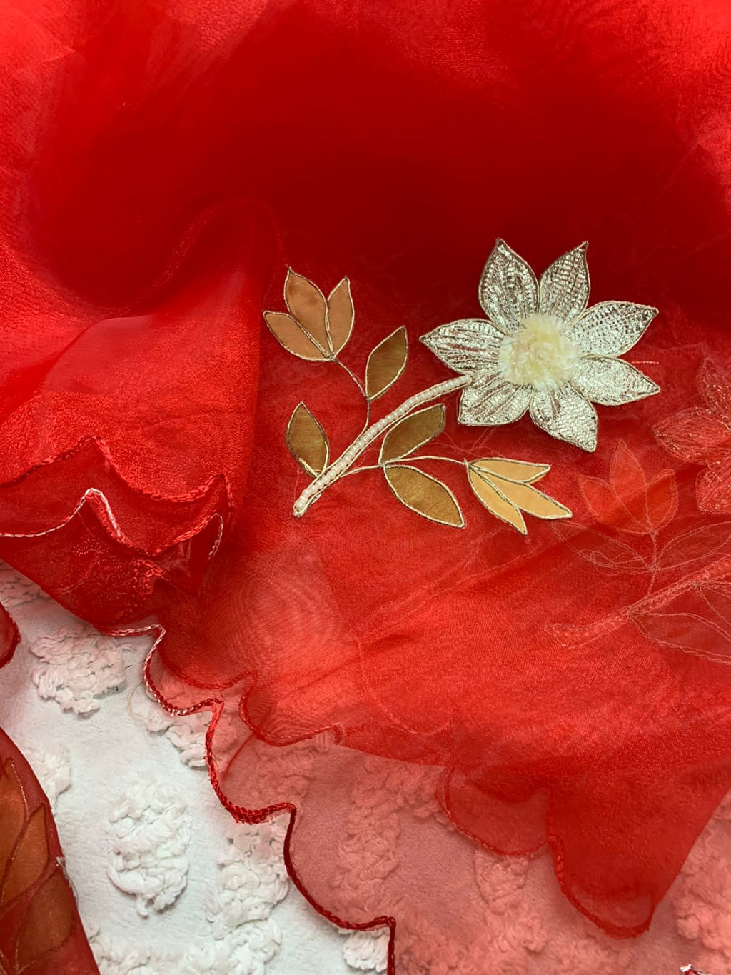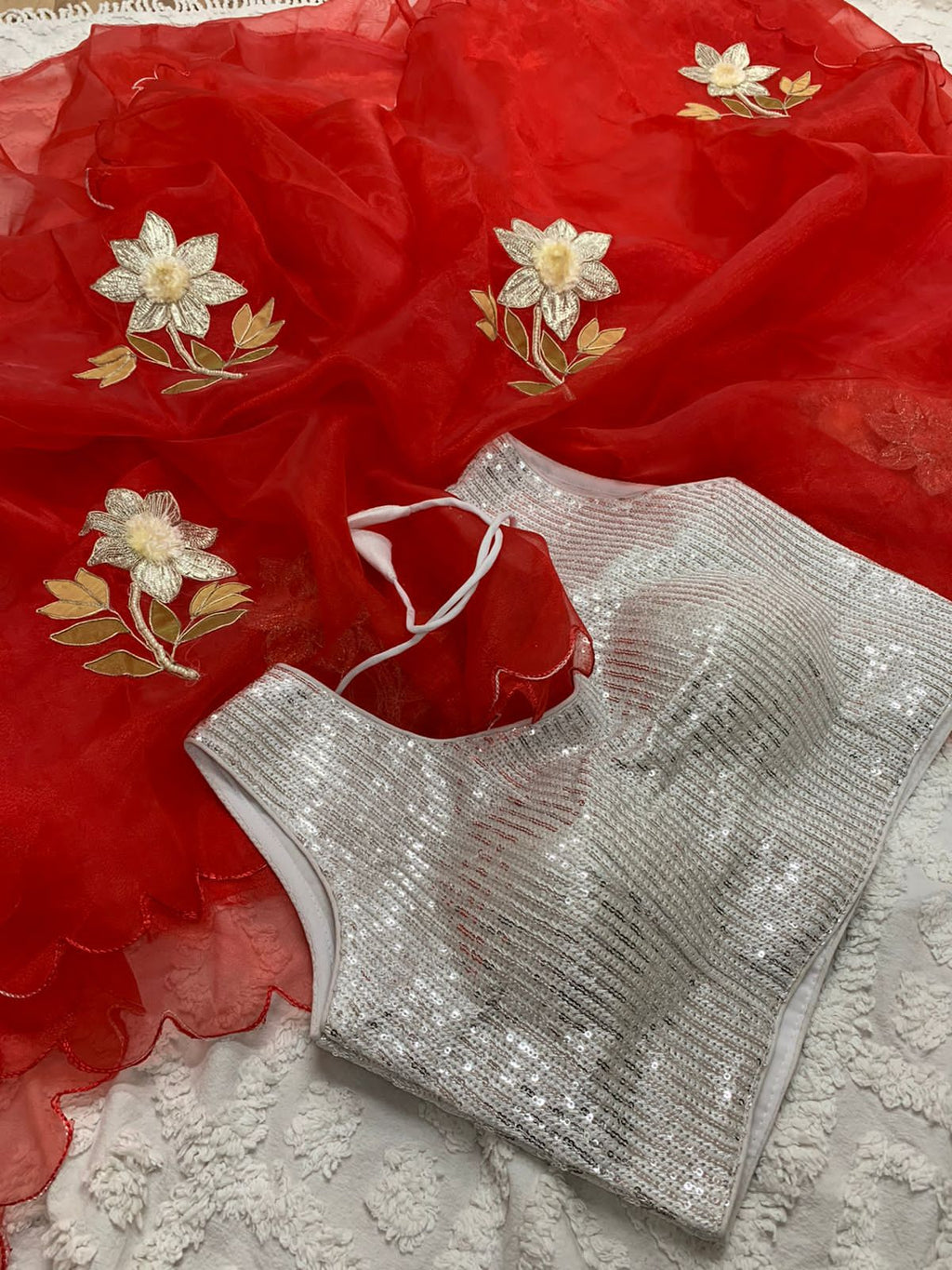 • Launching Unique Organza saree in beautiful red shade and gorgeous hand stone work with digital floral work all over the saree with cutwork over the border. It is paired with contrast stitched worked blouse.