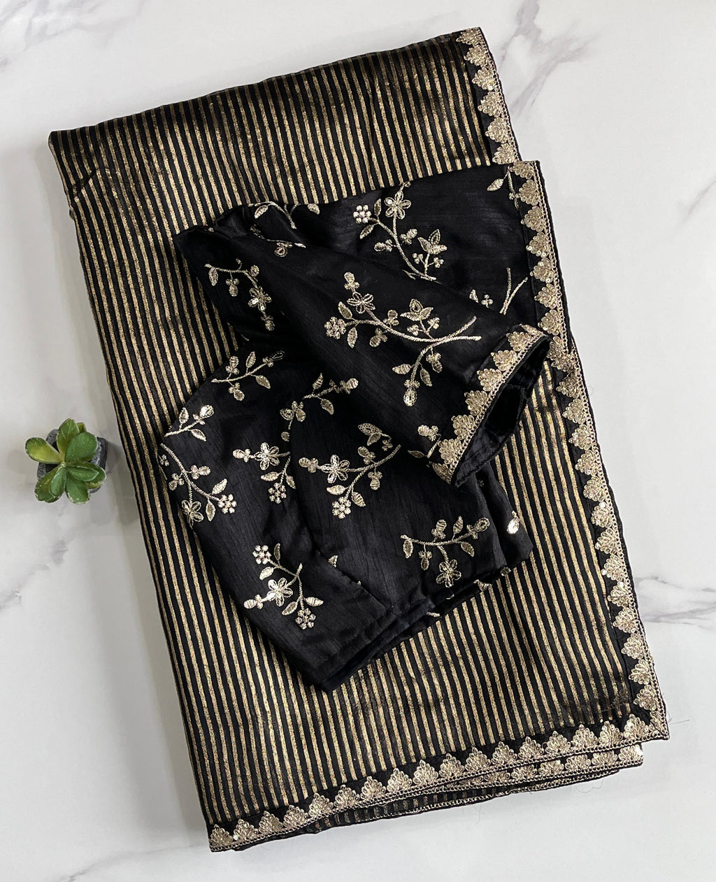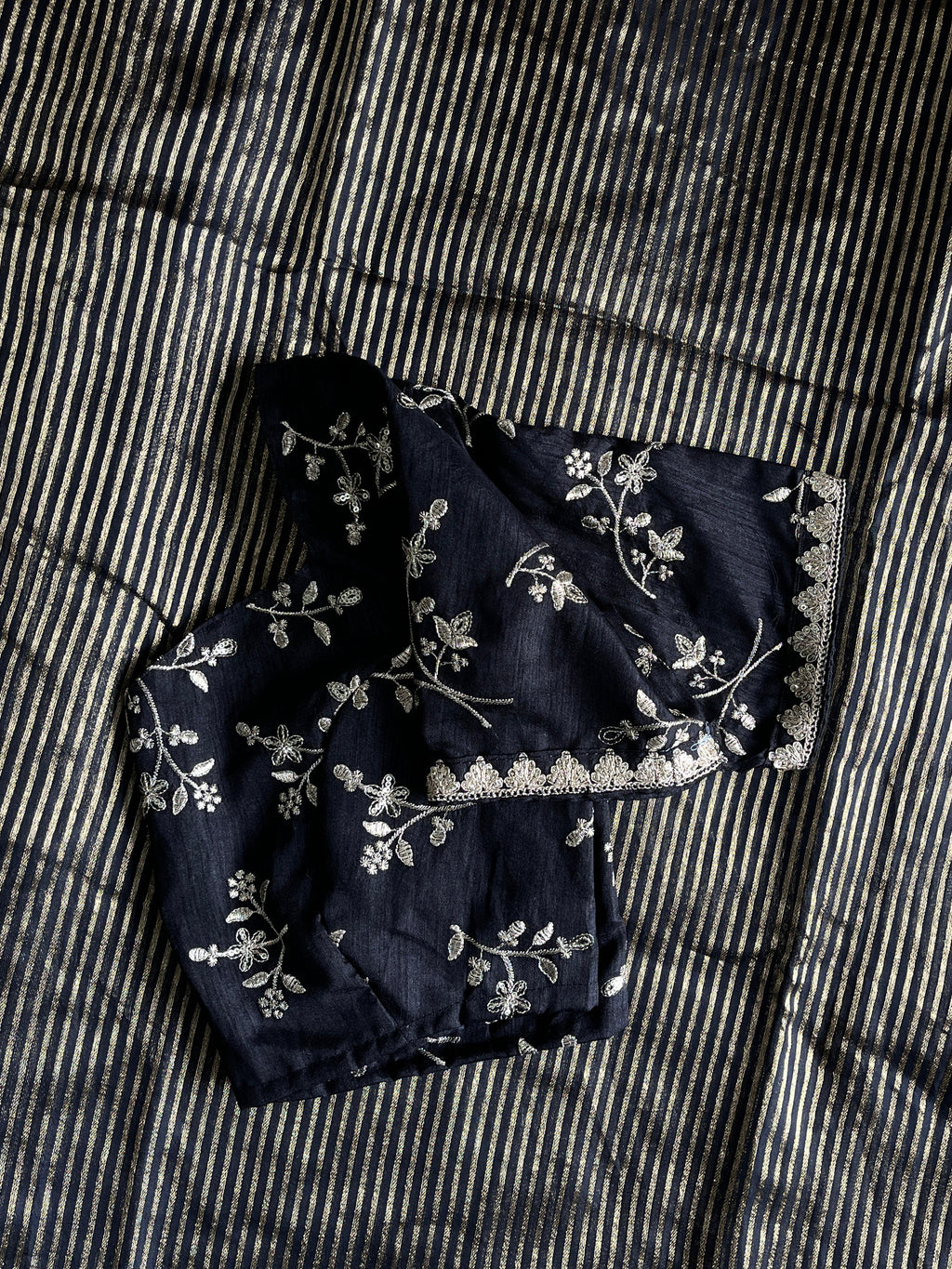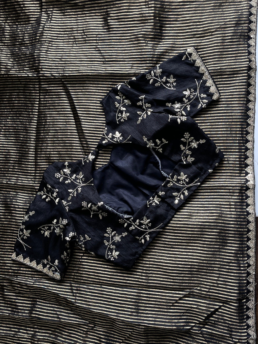 The borders are embellished with fine embroidery and sequin work, creating an elegant finish that makes this saree stand out for special occasions. To complement the drape, it comes with a stitched blouse featuring embroidery and sequins, customizable in both pattern and measurements for the perfect fit.