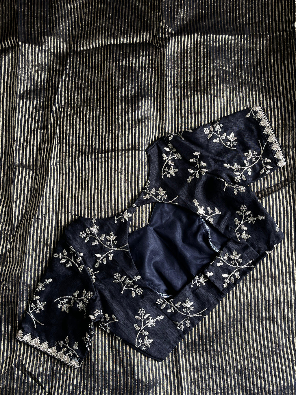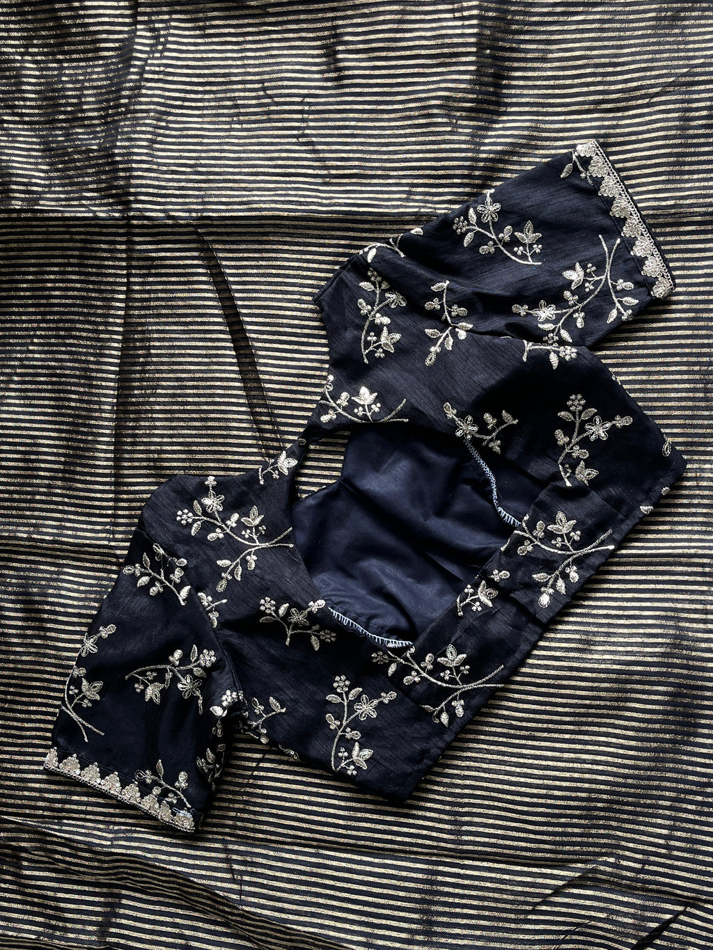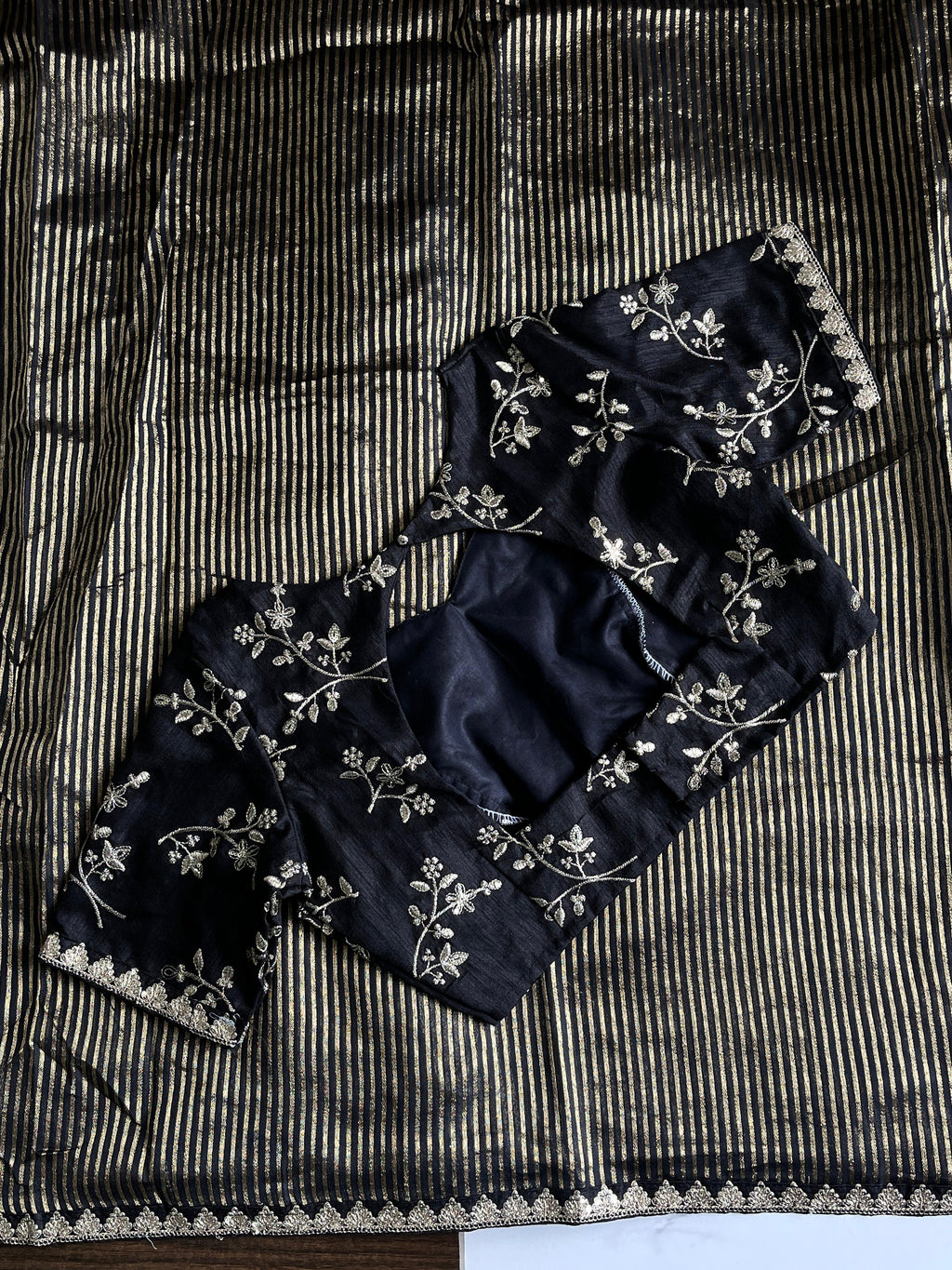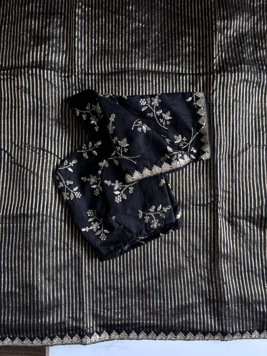 The borders are embellished with fine embroidery and sequin work, creating an elegant finish that makes this saree stand out for special occasions. To complement the drape, it comes with a stitched blouse featuring embroidery and sequins, customizable in both pattern and measurements for the perfect fit.