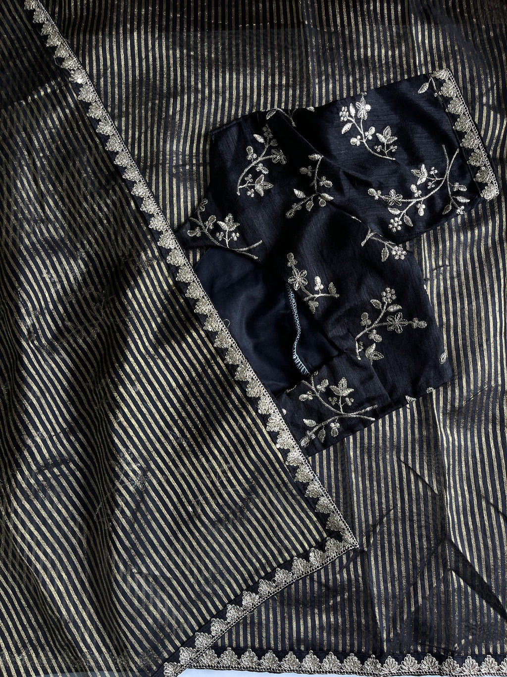 Capture the essence of celebrity style with this organza tissue saree, designed with subtle shimmer and a graceful fall. The drape features weaving stripes all over, giving it a delicate texture that enhances its luxurious appeal.